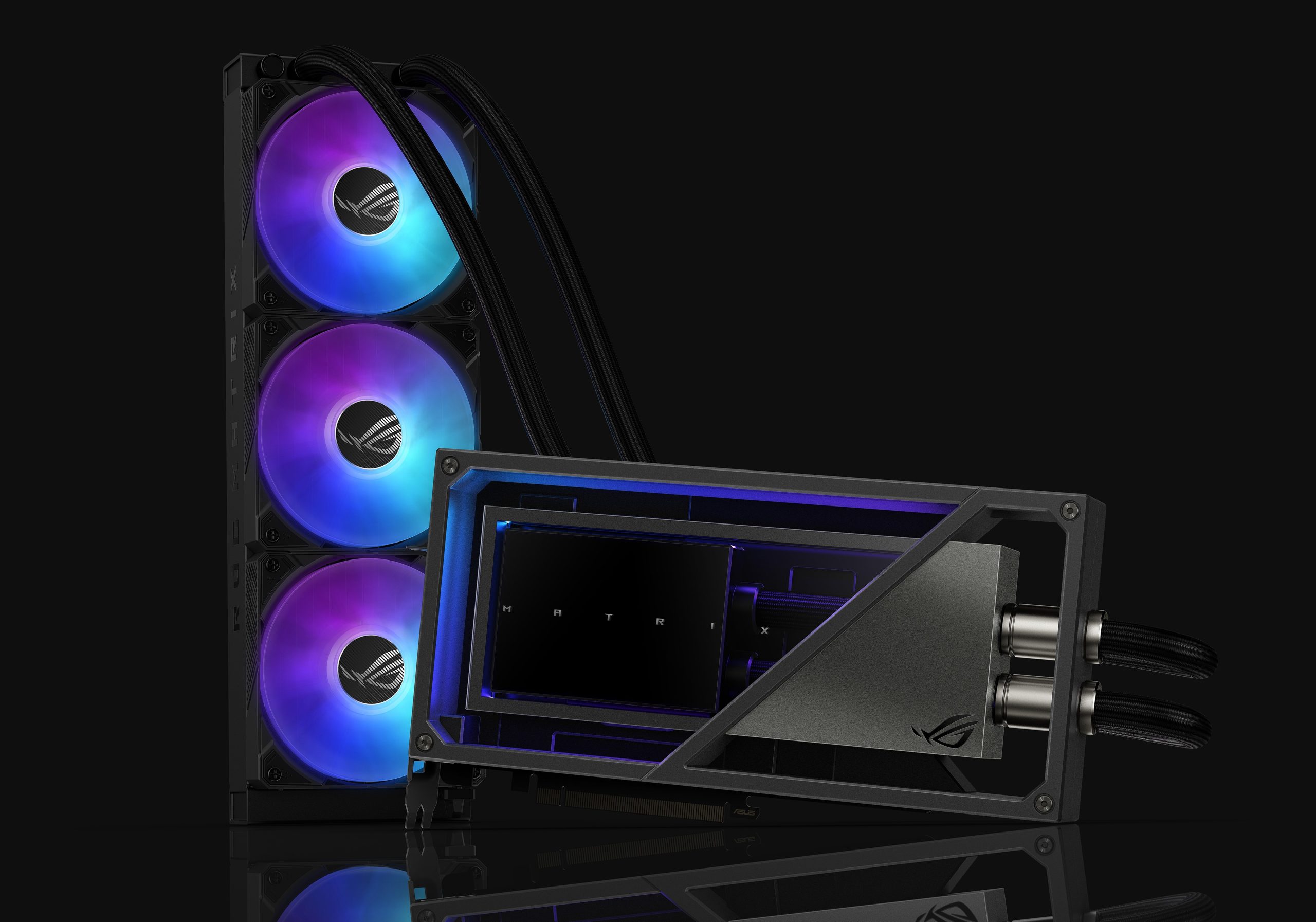 La mayoría de las GPU líquidas con refrigeración AIO, incluida la línea ROG Strix LC, requieren un pequeño ventilador en la propia tarjeta para mantener frescos los componentes montados en la superficie, además de los ventiladores montados en el radiador que mantienen bajo control el calor de la GPU. La placa fría personalizada de cobertura total en la ROG Matrix RTX 4090, sin embargo, elimina la necesidad de un ventilador auxiliar, ya que hace contacto con todos los componentes que generan calor en la PCB, permitiendo que el radiador enfríe toda la tarjeta por sí mismo. Una bomba personalizada y más potente suministra al radiador más refrigerante que cualquiera de nuestros diseños anteriores, manteniendo la ROG Matrix GeForce RTX 4090 funcionando con máxima eficiencia en todo momento.