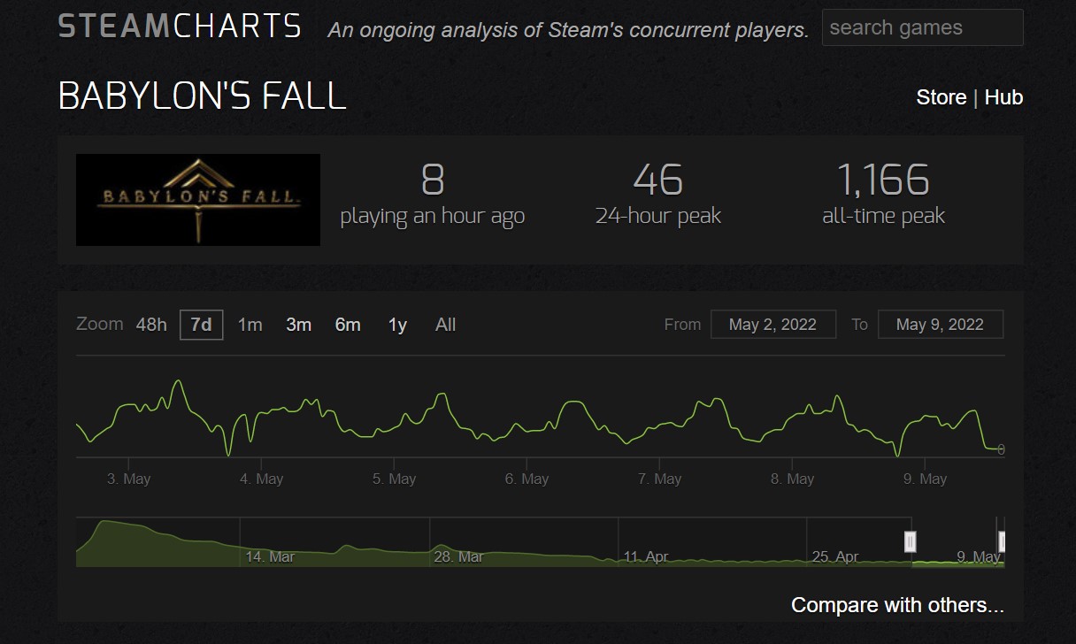 Según Steam Charts Data, Babylon’s Fall apenas logró captar unos 60 jugadores recurrentes en sus primeros 30 días en el mercado en la plataforma Steam. En comparación, el vapuleado Outriders —que también ha sido olvidado por los gamers— llegó a casi 900 jugadores en ese mismo lapso de tiempo.