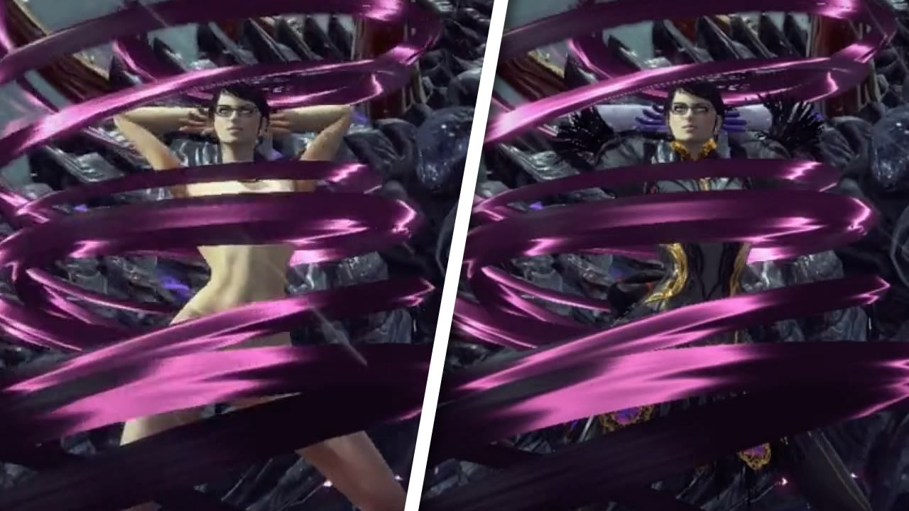 El video muestra unas comparativas de las secuencias de hechizos de Bayonetta 3 en las que la bruja utiliza su cabello mágico para invocar sus poderes, pero quedándose desnuda en el proceso. Con el modo Naive Angel activado, el personaje no perderá sus ropas durante el encantamiento.