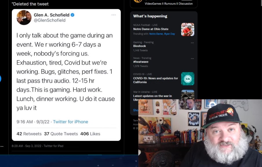 El controversial director, quien en sus streams no se anda con rodeos y es conocido por opinar «sin pelos en la lengua», felicitó a Glen Schofield, jefe del estudio Striking Distance. Schofield había publicado un tweet en el que indicaba que ‘estaban trabajando de 6 a 7 días a la semana, y de 12 a 15 horas al día para terminar su juego‘, lo que se conoce como «crunch».