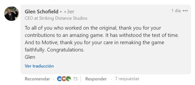 Glen Schofield, una de las mentes creadoras del aclamado Dead Space de 2008, agradeció al estudio Motive por su gran trabajo en el remake del juego, el cual fue lanzado por EA a finales de enero.