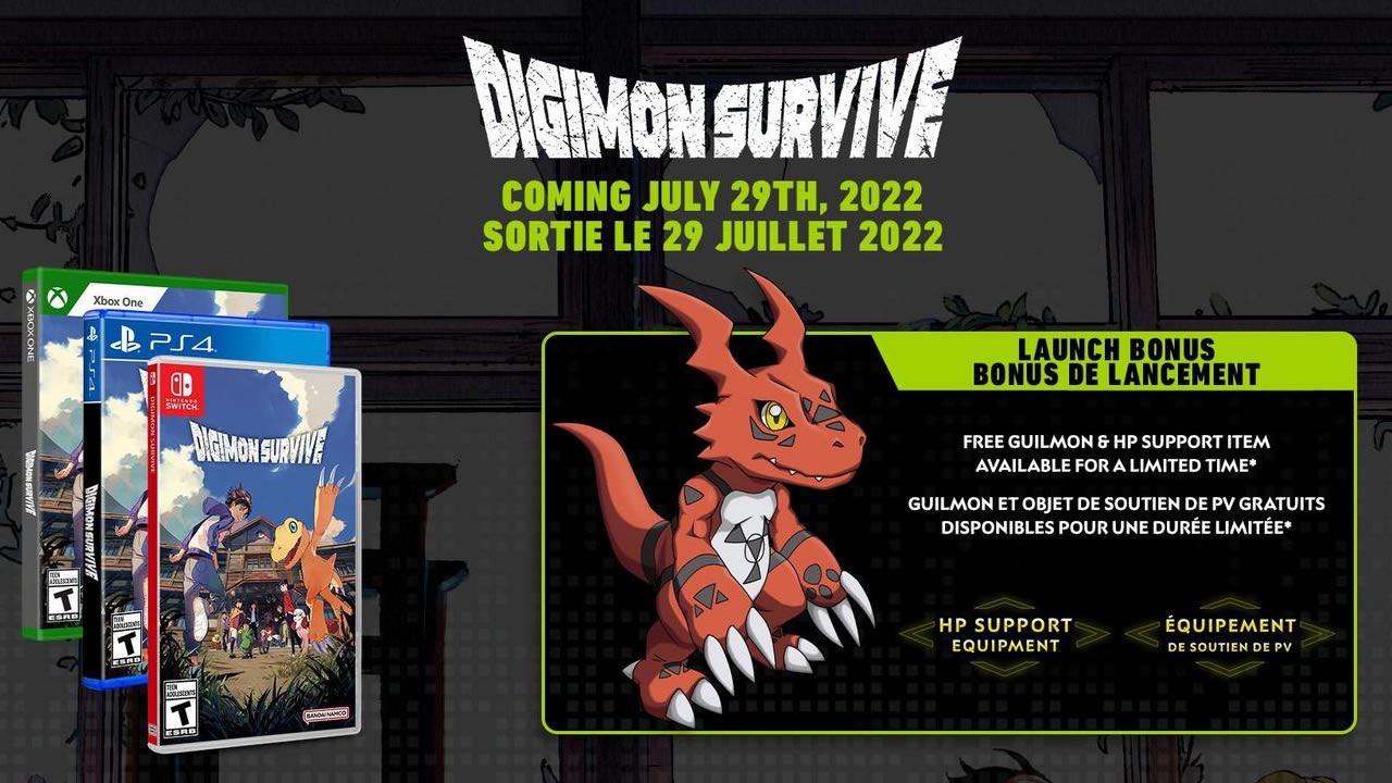 DIGIMON SURVIVE ya está disponible en formatos digitales en PlayStation 4 (compatible con PlayStation 5), Xbox One (compatible con Xbox Series X|S), Nintendo Switch y PC a través de STEAM. Los jugadores que compren el juego digital antes del 30 de agosto recibirán artículos bonus, incluidos el DLC Guilmon y el equipo de soporte HP. El producto físico estará disponible el 9 de septiembre e incluye todos los bonos de lanzamiento para las compras realizadas en los primeros 30 días.