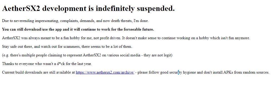 Mediante una publicación, la persona detrás de AetherSX2 anunció que el desarrollo del emulador se suspendía completamente después de haber recibido amenazas de muerte, provocando que dicho desarrollador decidiera abandonar internet y advirtiendo que la gente no se deje estafar por personas o páginas que aseguran ser fuentes confiables respecto al emulador de PS2.