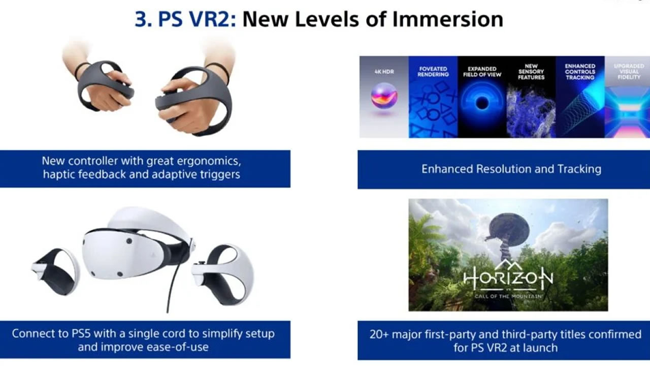 El nuevo visor de realidad virtual PlayStation VR 2 llegaría a tiendas con más de 20 juegos de lanzamiento; esto según una presentación corporativa de Sony Interactive a la que tuvo acceso el medio Video Games Chronicle. En una dispositiva, se muestra un recuadro con la frase «Más de 20 títulos first-party y third-party confirmados para el lanzamiento de PSVR 2».