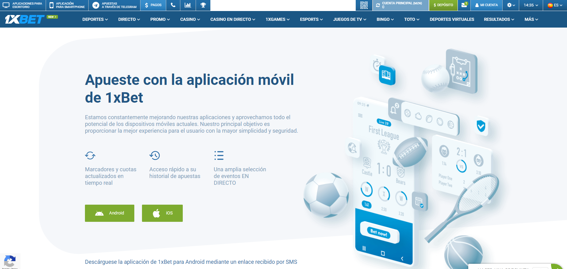 La aplicación móvil de 1xBet para Android no difiere prácticamente de la página web oficial de la casa de apuestas en cuanto a características. El usuario podrá hacer una apuesta tanto antes del partido, como en el modo Live (en vivo). La oferta de eventos es muy amplia. La empresa pone cotizaciones en todos los deportes, ciber-deportes, casino, deportes virtuales, y póker.