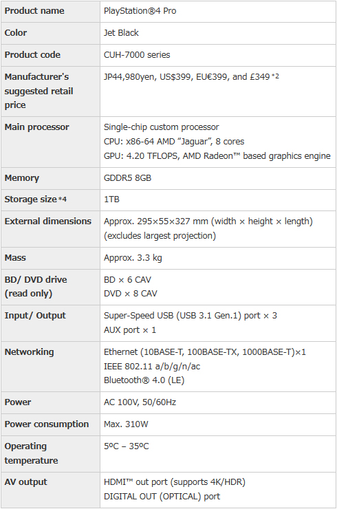 PlayStation 4 Pro estará disponible a nivel mundial desde el 10 de Noviembre, al precio sugerido de $399 en USA. La Pro marca la primera vez en la historia de PlayStation que un sistema más poderoso es lanzado a la mitad del ciclo de vida de la plataforma: la Pro no reemplazara al standard PS4, y al parecer, ambas serán complementarias.