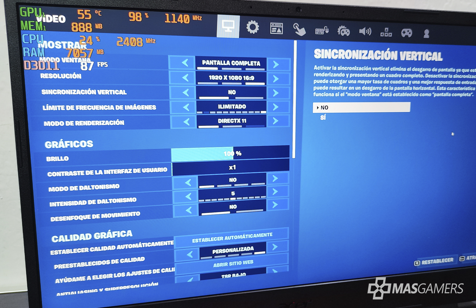 Y hablando de juegos, no podía faltar las pruebas con diferentes juegos, empezando con el legendario Fortnite, juego que exige gráficos moderadamente, es por ello que aprovechamos las características de la Nitro 5 para jugarlo en gráficos en alto, llegando a un máximo de 50fps, incluyendo RTX activado, sin embargo, con unos gráficos en medio, y RTX desactivado, se pudo llegar a más de 100fps, en ambos ejemplos, Fortnite ha sido jugable sin nungun problema, haciendo la diferencia gráfica, la única variante.