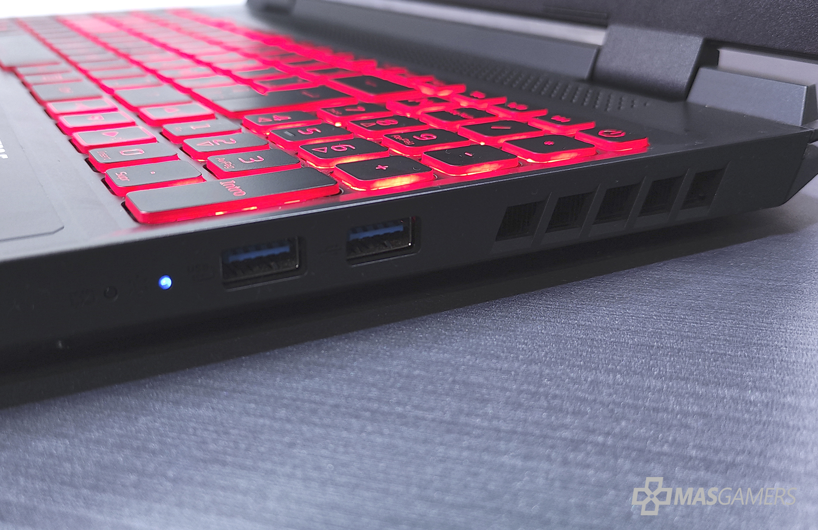Por el lado izquierdo encontraremos el conocido bloqueo o candado, además de una ventilación junto con un puerto ethernet, y una entrada USB A de 2.0 y además de una entrada de Jack 3.5mm que nos servirá tanto como para audífonos y micrófonos. Por el lado derecho, contaremos con dos entradas USB A de 2.0, dos indicadores led, y otra ranura de ventilación.