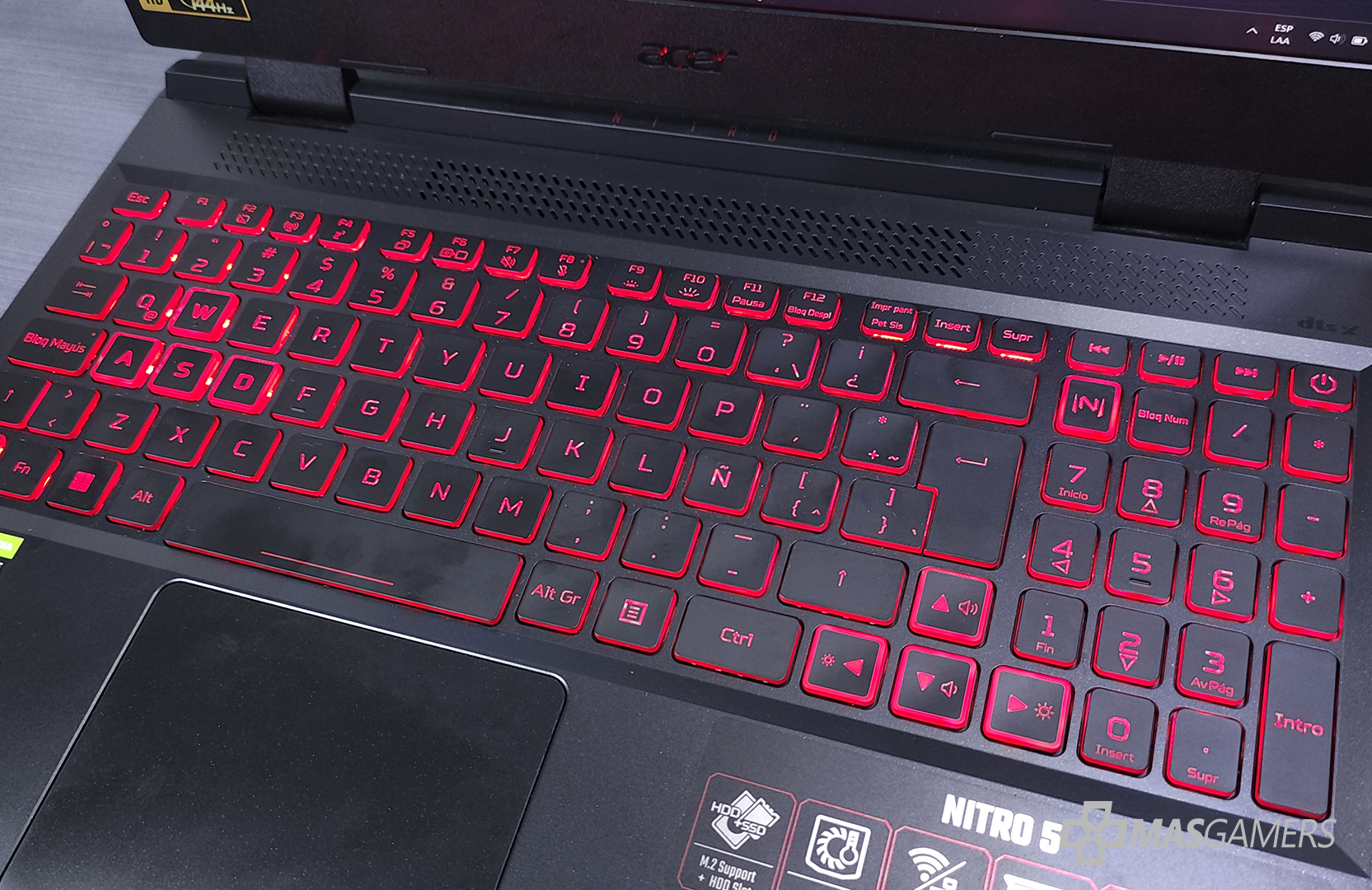 Contaremos con un teclado retroiluminado en rojo, pudiendo ajustar la intensidad del brillo, destacando las teclas WASD que estarán bien iluminadas, así mismo contaremos con un generoso TouchPad, que nos será de mucha utilidad, y que responde bastante bien tanto con los clics derechos e izquierdos.