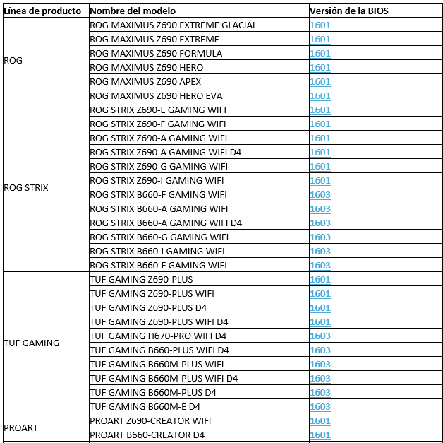 Todas las actualizaciones de la BIOS UEFI para soporte de las placas base están ya disponibles, a través del sitio web de soporte de ASUS en https://www.asus.com/microsite/motherboard/Intel-Alder-Lake-Z690-H670-B660/latin/#BIOS-UPDATE.