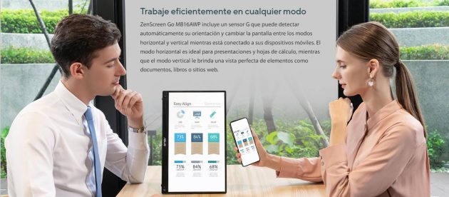 Un sensor G integrado permite la rotación automática, detectando la orientación de la pantalla y cambiando automáticamente entre los modos horizontal y vertical. Además, el nuevo diseño del parante, eleva la ZenScreen Go MB16AWP para una posición de visualización cómoda en cualquier situación. Una toma roscada de ¼ de pulgada en la parte trasera del monitor permite un fácil montaje con trípodes estándar, lo que permite a los usuarios ahorrar espacio en el escritorio. Lo mejor de todo es que el compacto ZenScreen GO MB16AWP es ideal para la vida en movimiento, con un chasis delgado de 11,5 mm que se desliza fácilmente en cualquier bolsa de viaje o de mensajero.