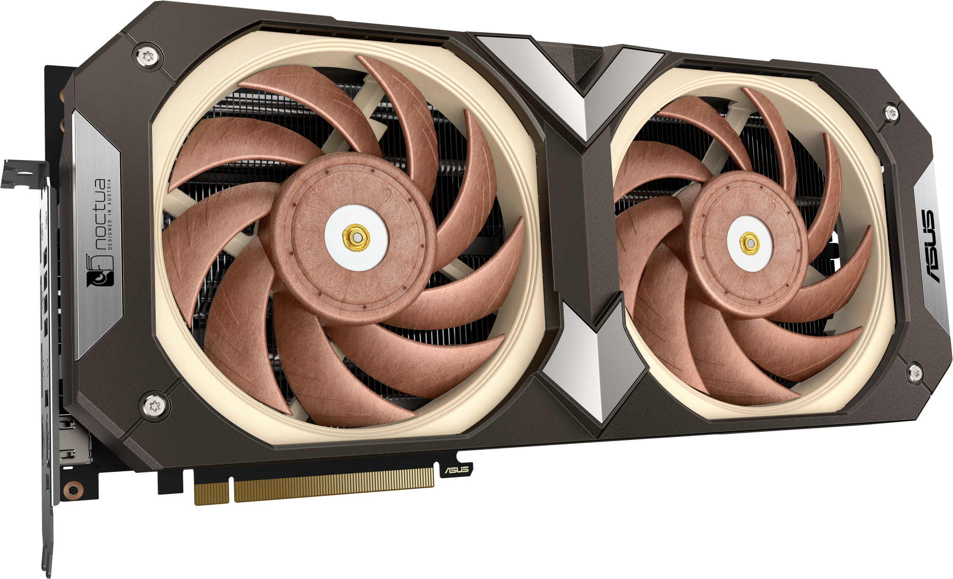 ASUS sabe que los entusiastas de Noctua se preocupan tanto por la estética de sus productos como por el alto rendimiento y los bajos niveles de ruido. En consecuencia, ASUS creó una cubierta marrón personalizada para los ventiladores Noctua, que complementa su distintivo esquema de colores y proporciona un sistema de montaje seguro, sin necesidad de bridas. Los logotipos de ASUS y Noctua en el frontal y los laterales de la cubierta, junto con los sutiles gráficos de la placa posterior de aleación, ayudan a que esta tarjeta combine a la perfección con otros componentes Noctua del sistema.