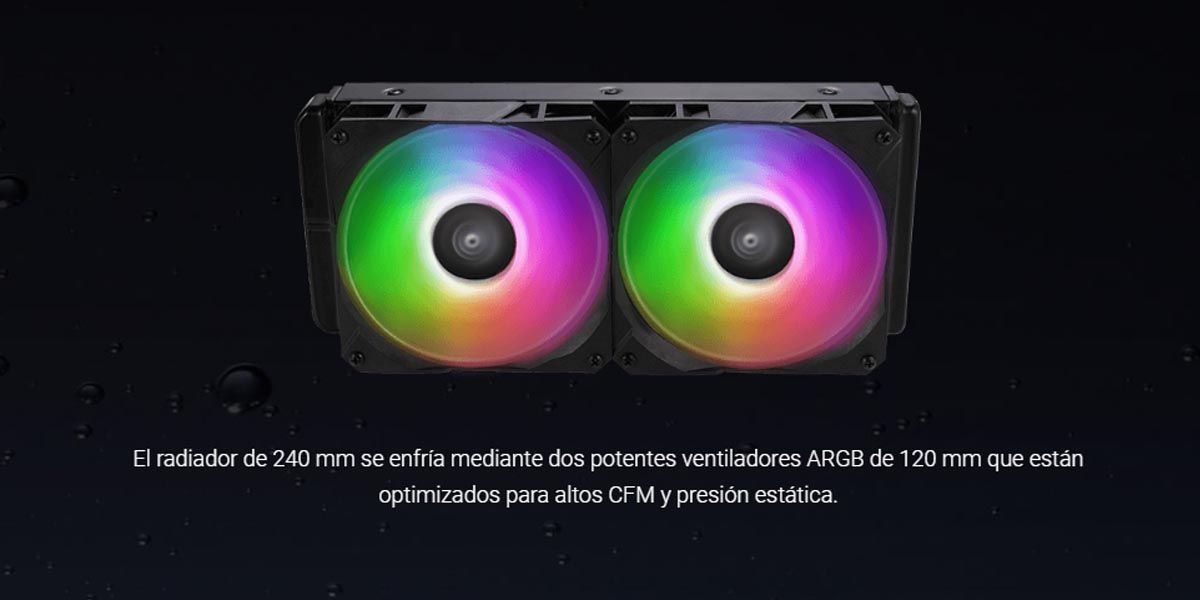 El radiador de 240 mm está refrigerado por un par de ventiladores ARGB de 120 mm ajustados para mover grandes cantidades de aire de refrigeración a alta presión estática. Un ventilador de tipo soplador y un disipador de bajo perfil bajo la cubierta expulsan el calor producido por los componentes de suministro de energía, todo ello en un delgado diseño de 2,6 ranuras.