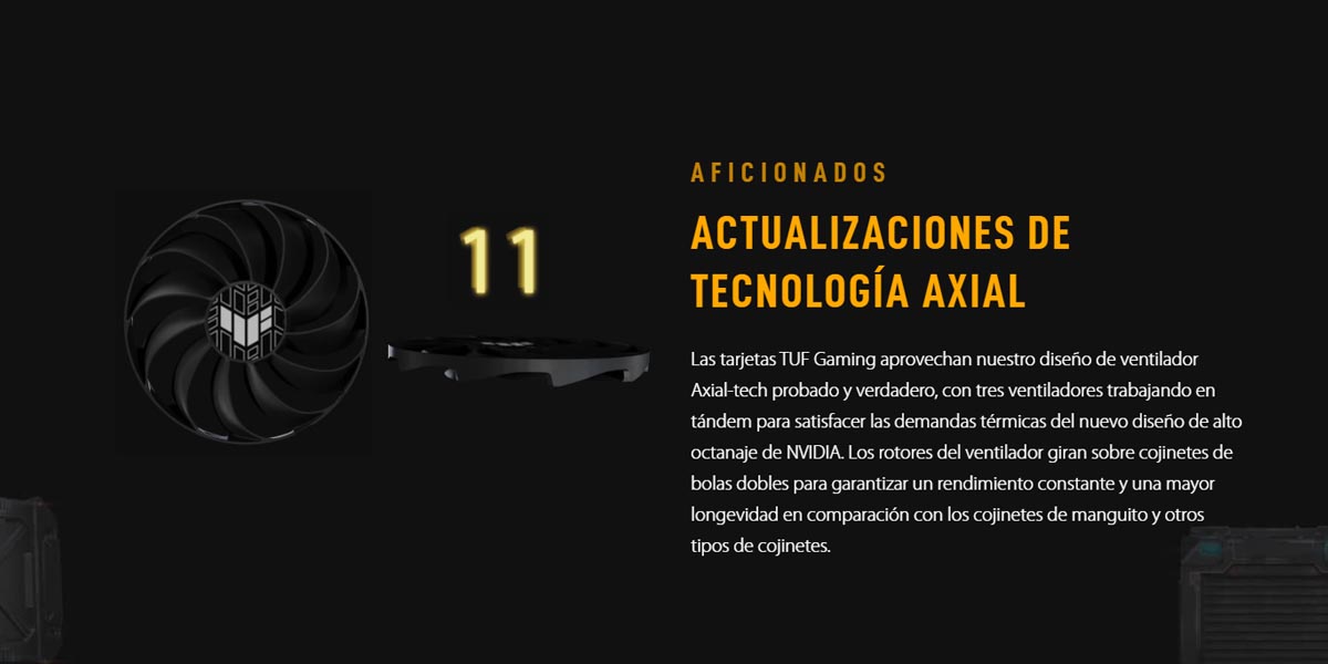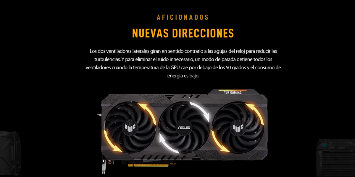 Un trío de ventiladores Axial-tech empuja una gran cantidad de aire a través del disipador de alta superficie. ASUS ha aumentado la anchura de cada ventilador a 1,5 cm para aumentar la presión estática, y los tres ventiladores tienen un anillo de barrera de media anchura que concentra el aire justo donde se necesita. El ventilador central gira en el sentido de las agujas del reloj, mientras que los dos de los flancos lo hacen en sentido contrario para reducir las turbulencias.