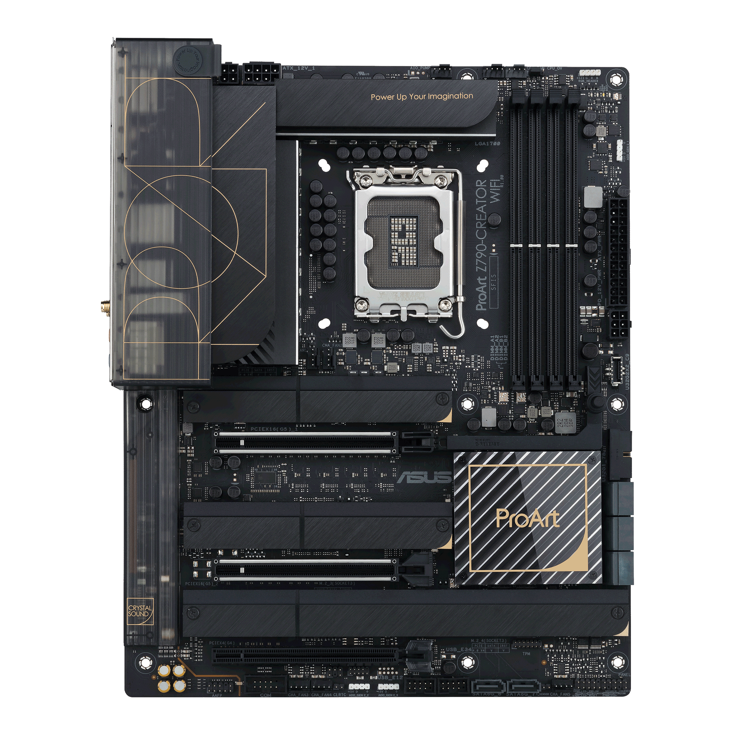 ProArt Z790-CREATOR WIFI: ¡Si sos creador de contenidos, esta es tu placa! Su principal atractivo está en su amplia gama de puertos, entre los cuales se destacan los dos puertos Thunderbolt™ 4® tipo C, que otorgan un ancho de banda de hasta 40 Gbps y conexión 2 pantallas 4k o una de 8k. También se le suman 2 puertos ethernet de 2.5 y 10 Gb, WiFi 6E, cuatro ranuras PCIe® 4.0 M.2 y un puerto de panel frontal USB 3.2 Gen 2×2. Cuenta con sistema de seguridad avanzado a través del software ASUS Control Center Express, en el cual el usuario puede activar o desactivar los puertos USB o configúralos como sólo lectura para evitar la fuga de datos; también setear una lista negra de software para evitar que se ejecuten aplicaciones que puedan comprometer la seguridad, así como también bloquear de forma remota el editor de registro y evitar cambios no autorizados.