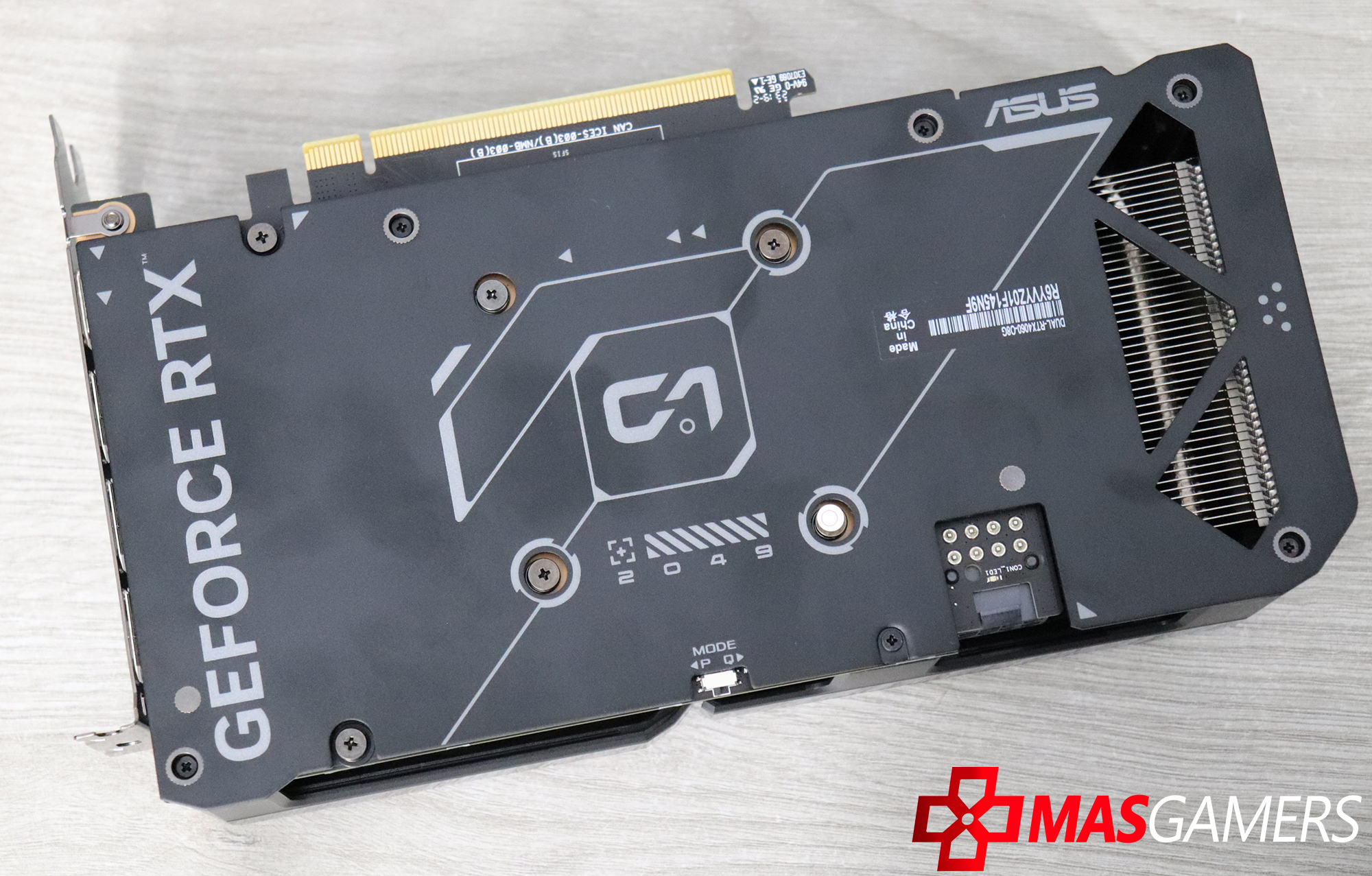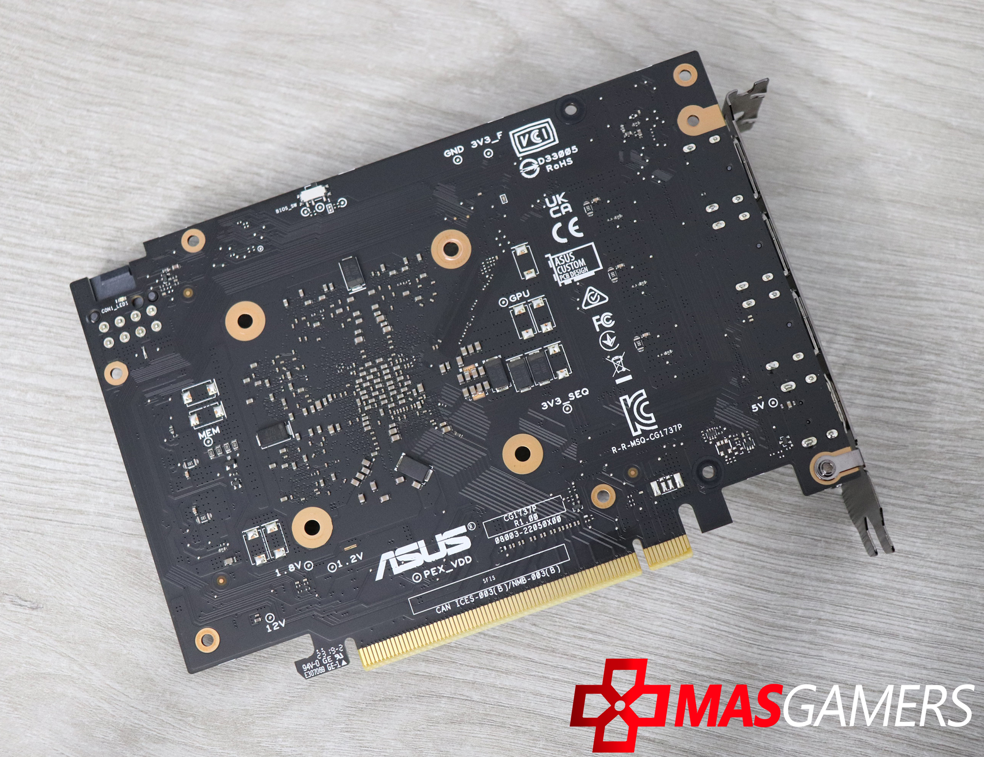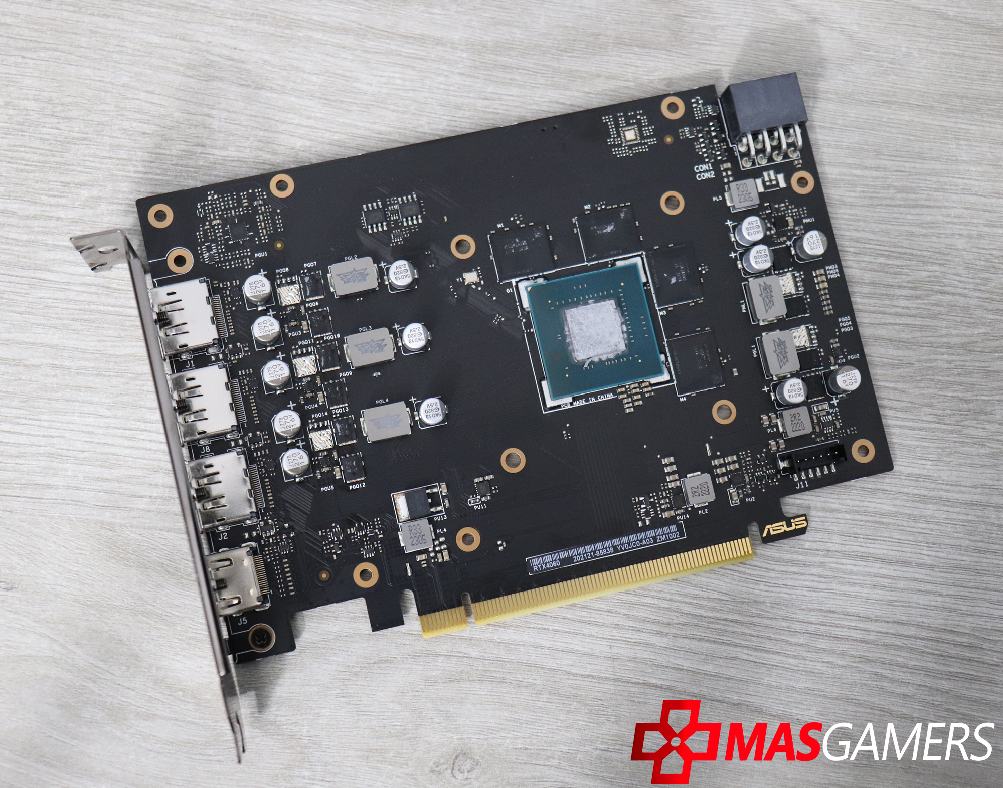 En una vista posterior vemos la presencia de una backplate que abarca todo el largo de la tarjeta y extensión de la disipación.