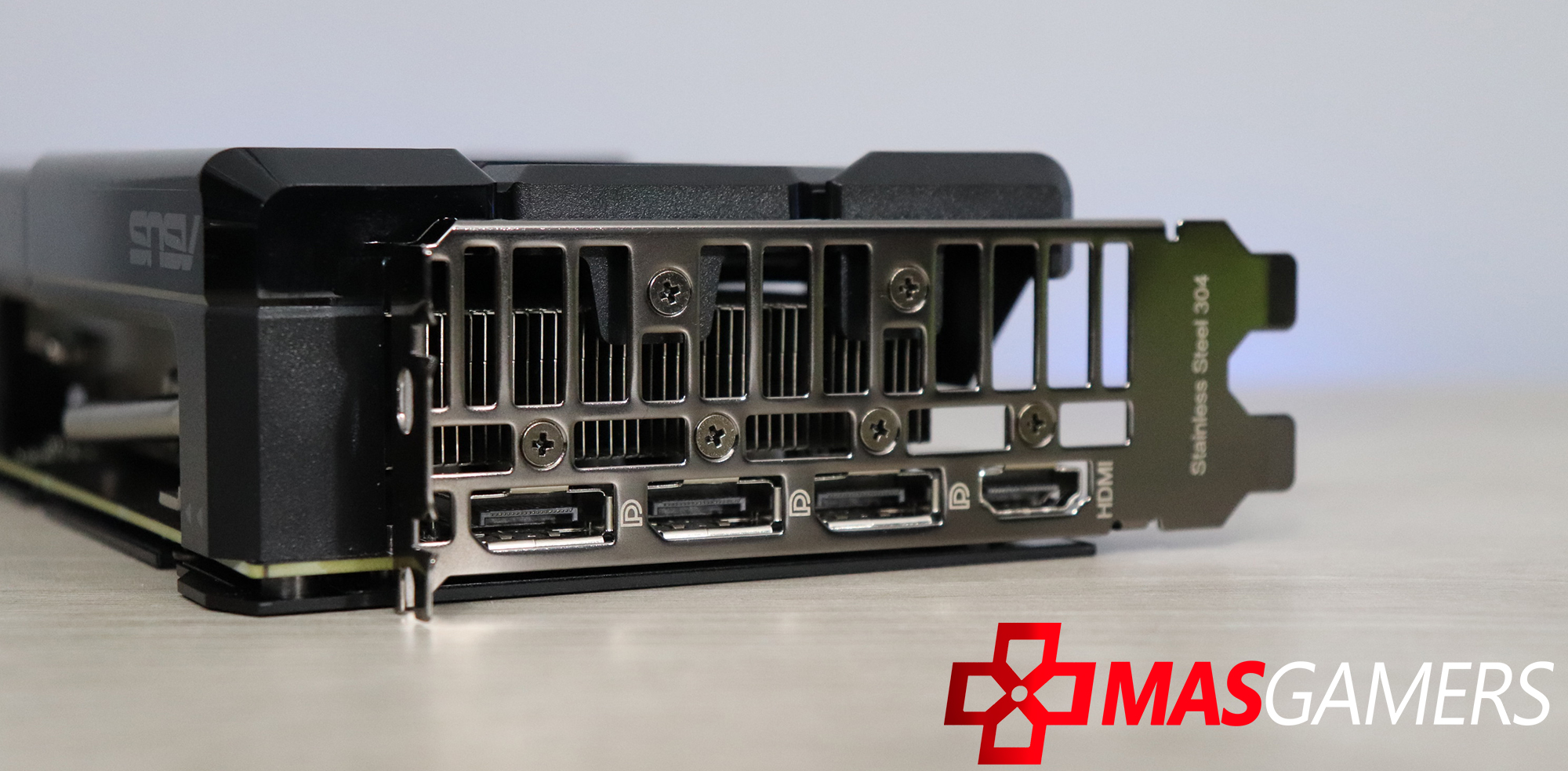 En cuanto a conectividad encontramos lo clásico: 3 puertos Display Port 1.4 y 1 puerto HDMI 2.1. Y como decíamos, si bien solo tiene 2 slots, es necesario dejar al menos 3 para que entre de todo.