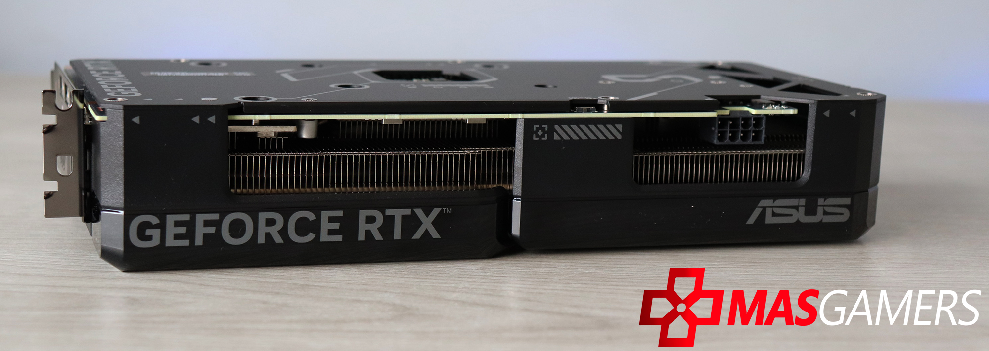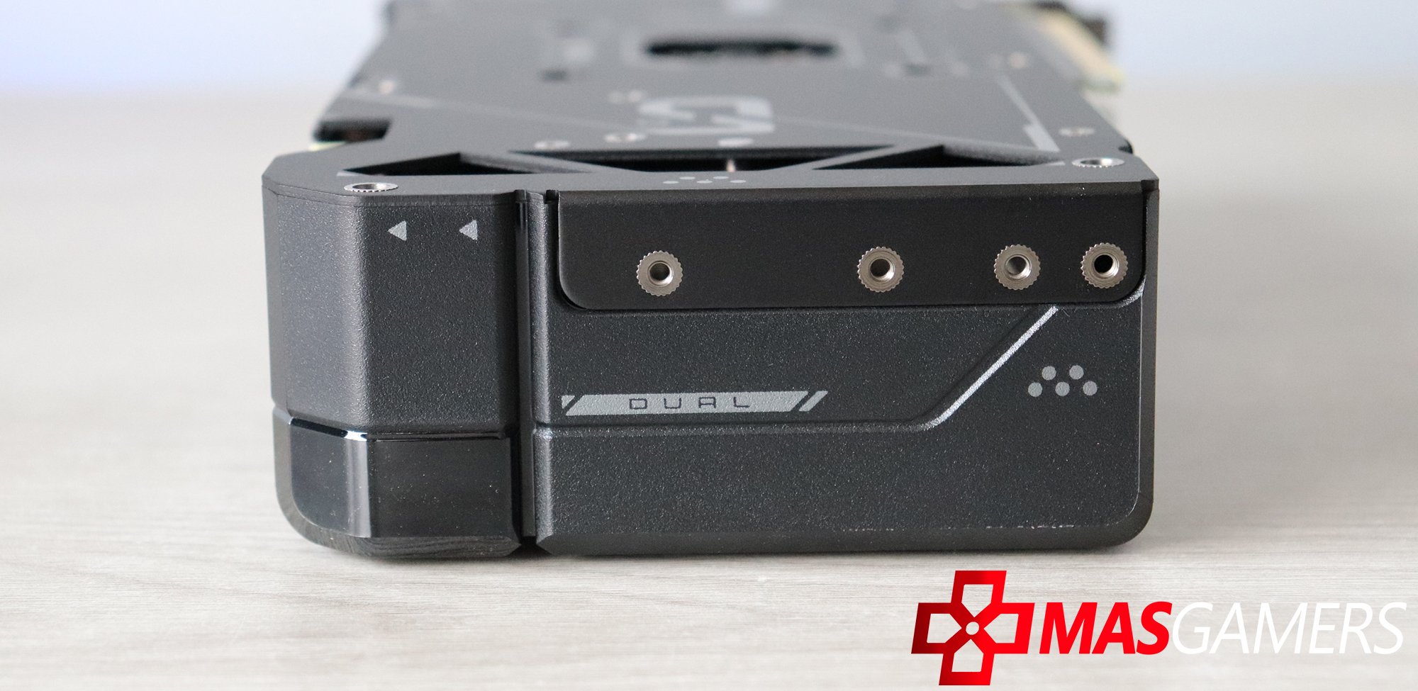 En una vista posterior vemos la presencia de una backplate que abarca todo el largo de la tarjeta y extensión de la disipación.