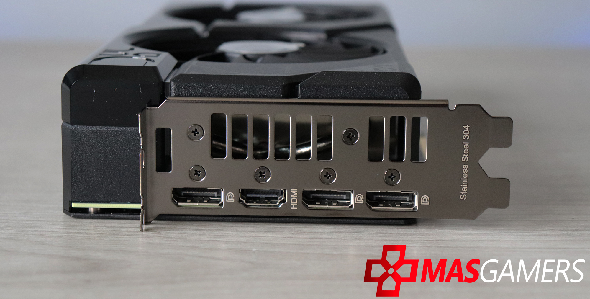 En cuanto a conectividad encontramos lo clásico: 3 puertos Display Port 1.4 y 1 puerto HDMI 2.1. Y como decíamos, si bien solo tiene 2 slots, es necesario dejar al menos 3 para que entre de todo.