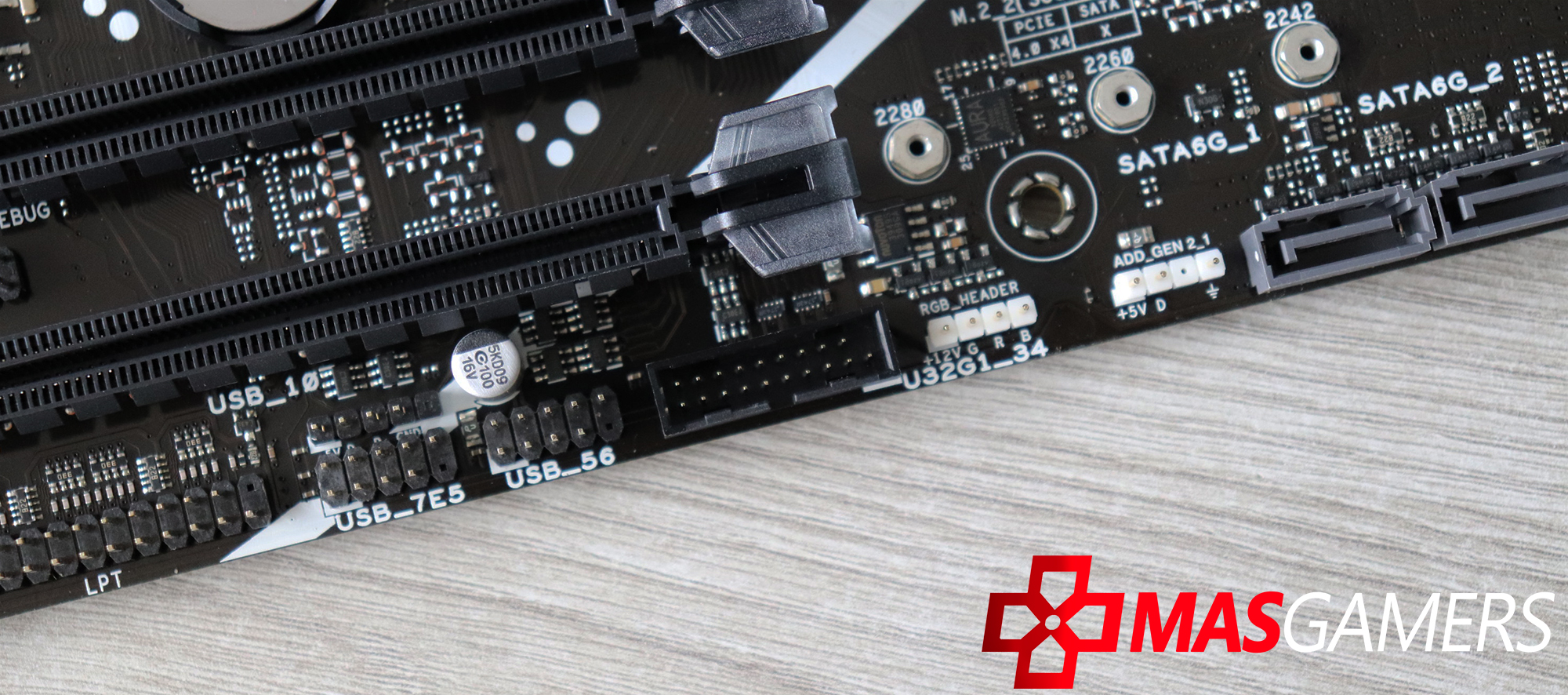 En cuanto a soporte de memoria, esta placa soporta hasta 192GB con velocidades de 7200 Mhz en DDR5 bajo la configuración de Dual Channel que es lo habitual en esta gama. Este detalle es crítico por si deseamos armar un equipo con un balance de precio / rendimiento. Y también al lado encontramos los conectores para USB internos tipo 3.2 A Gen 1 para nuestro case.