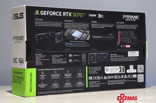 La ASUS Prime GeForce RTX 5070Ti se presenta en un empaque que refleja la filosofía de la línea Prime: funcionalidad, sobriedad y profesionalismo. La caja tiene un diseño limpio y estructurado, con una paleta de colores dominada por el blanco y el gris, acentuada por detalles en verde característicos de NVIDIA. En el frente, se destaca una imagen de la tarjeta gráfica, acompañada del logotipo de ASUS y la denominación «Prime Graphics Card», junto con especificaciones clave como «16GB GDDR7» y «PCIe 5.0» .
