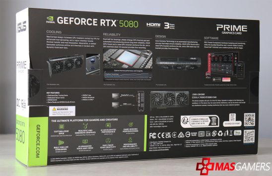 La ASUS Prime GeForce RTX 5080 se presenta en un empaque que refleja la filosofía de la línea Prime: funcionalidad, sobriedad y profesionalismo. La caja tiene un diseño limpio y estructurado, con una paleta de colores dominada por el blanco y el gris, acentuada por detalles en verde característicos de NVIDIA. En el frente, se destaca una imagen de la tarjeta gráfica, acompañada del logotipo de ASUS y la denominación «Prime Graphics Card», junto con especificaciones clave como «16GB GDDR7» y «PCIe 5.0» .