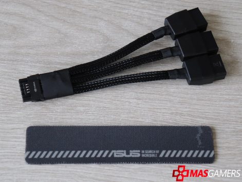 Bajo ellos se encuentra un disipador de gran tamaño con heatpipes de cobre y una base de contacto directo, que aseguran una transferencia de calor eficiente incluso bajo cargas intensas. En este toma podemos apreciar «MaxContact» que es un proceso de fabricación especial de ASUS que amplía eficazmente la superficie del disipador de calor situado sobre la GPU en un 5 %, en comparación con los diseños tradicionales. Esto reduce la temperatura hasta en 2 °C.
