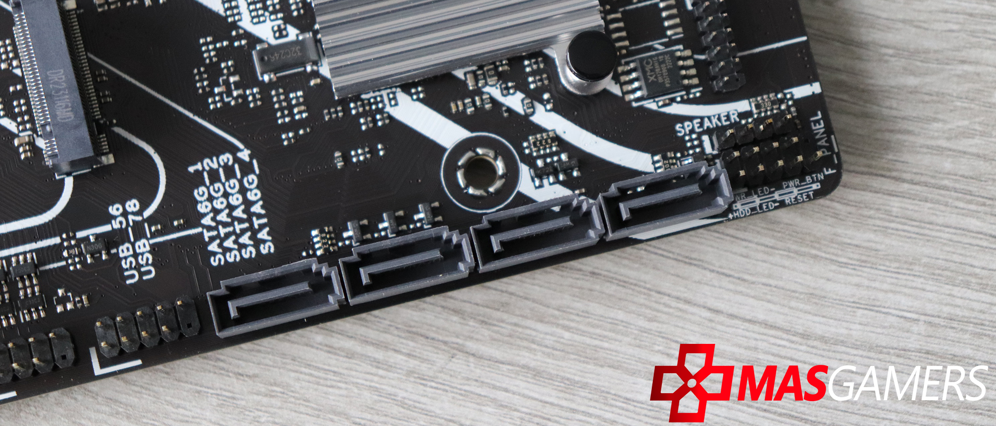 También podemos apreciar ambos slots para unidades M.2 que solo funcionan bajo el protocolo PCIe, por lo que se descarta totalmente el uso de unidades M.2 SATA. Así que bajo esto, solo nos queda usar alguno de los 4 puertos SATA que están en la parte