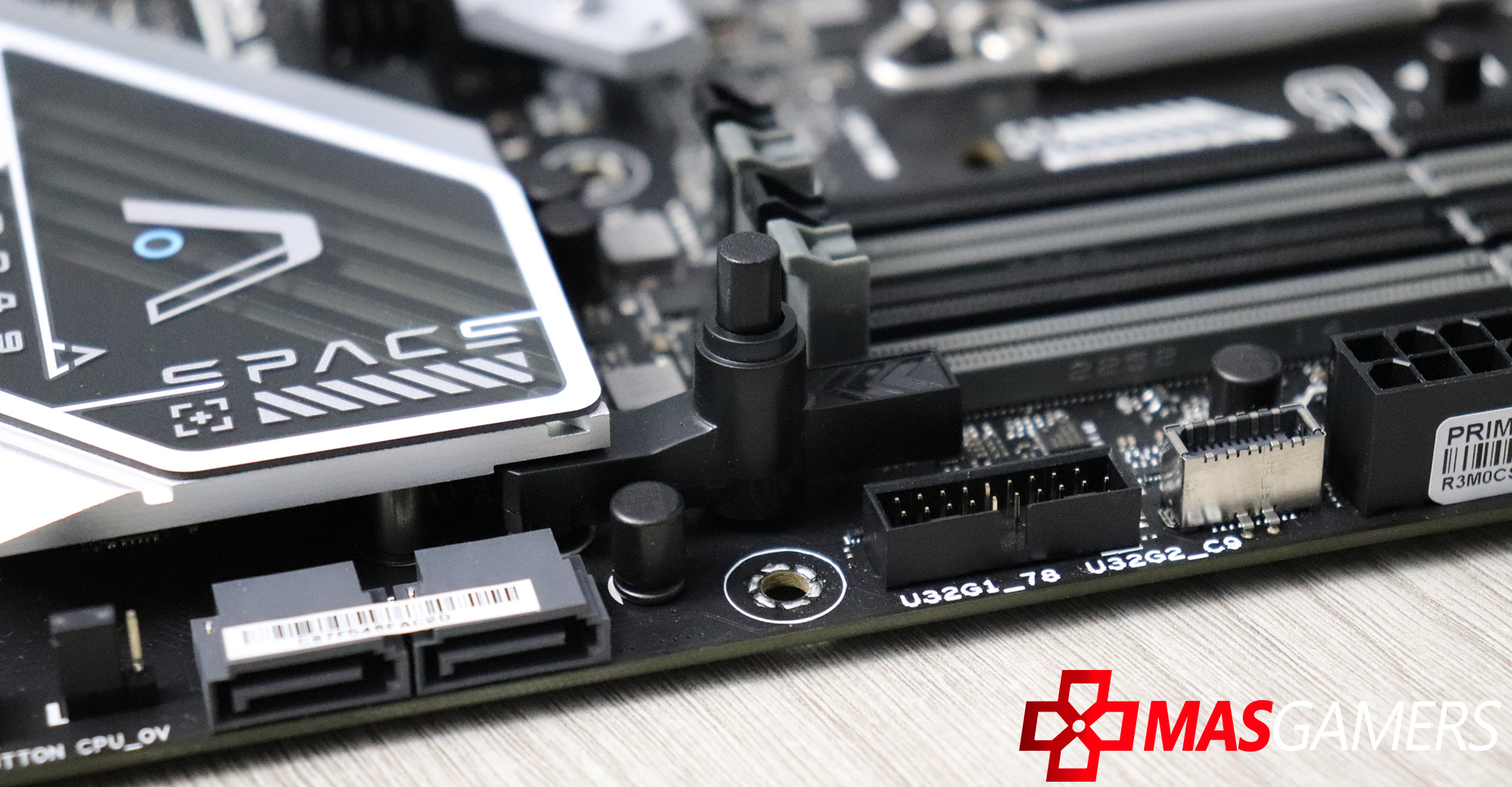 También encontramos los tradicionales puertos SATA, que en esta ocasión son 4 disponibles. Y justo al lado encontramos 2 botones que son de CLR_CMOS y PWR_BUTTON.
