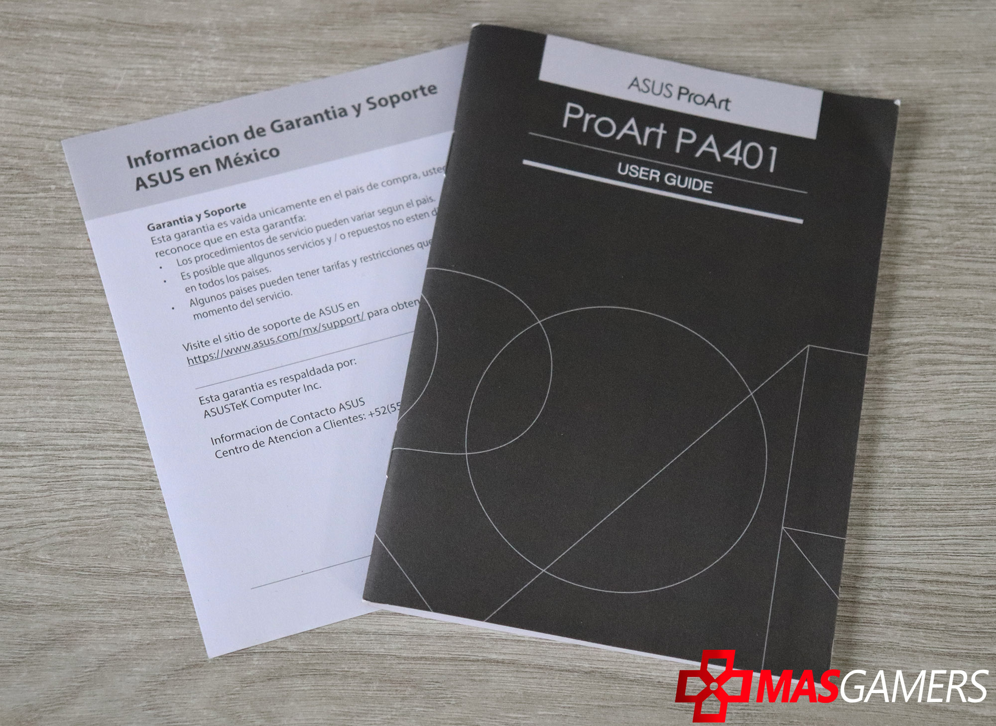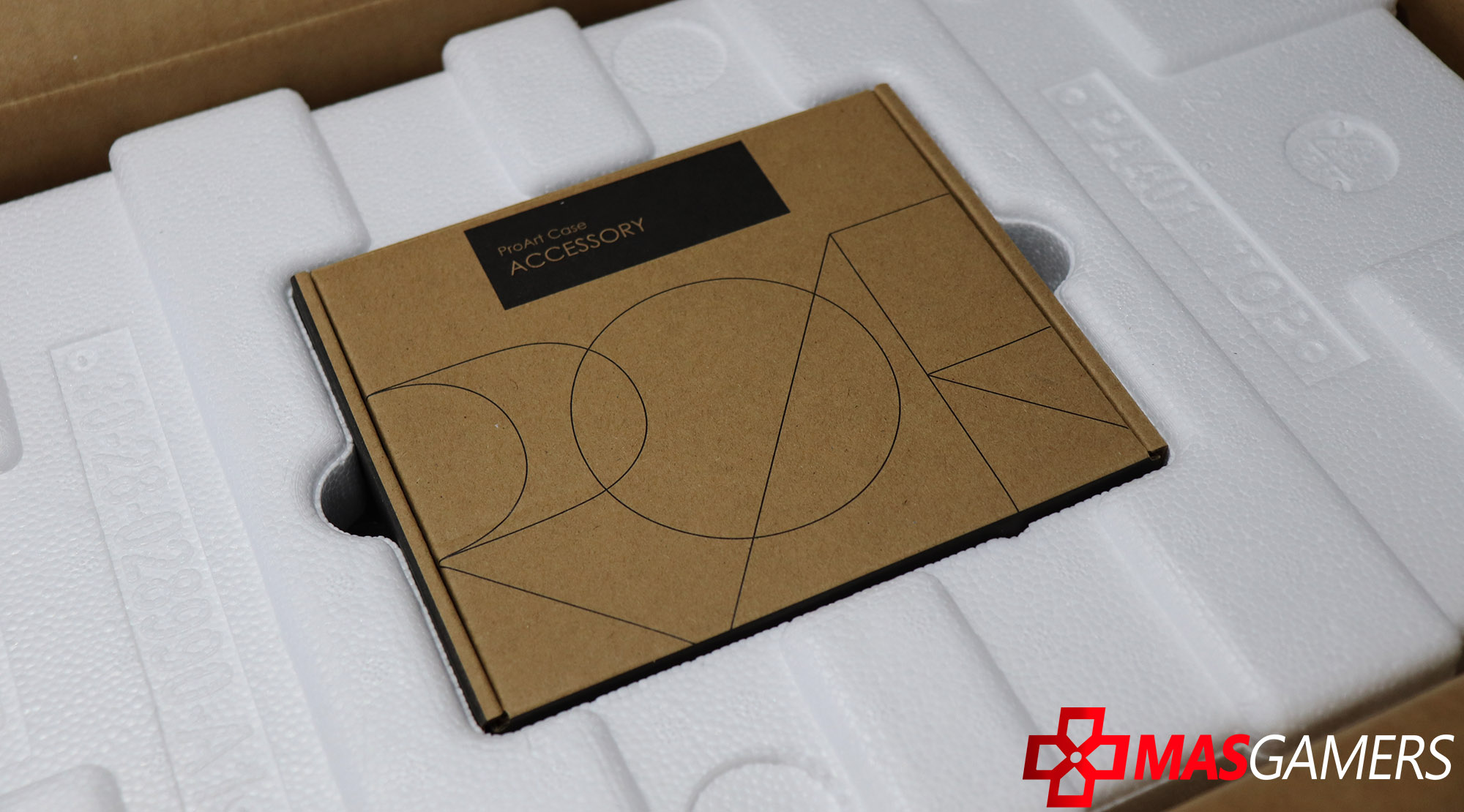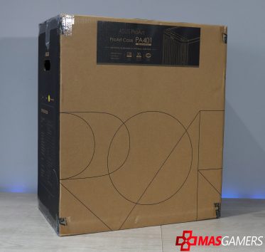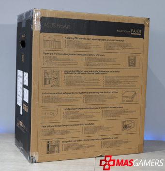 El empaque del ASUS ProArt PA401 refleja el enfoque sobrio y profesional de la línea ProArt. La caja está fabricada en cartón grueso de gran tamaño, resistente para proteger el chasis durante el transporte. A diferencia de los empaques llamativos de la gama gaming, aquí se apuesta por un diseño minimalista, con un acabado en tono marrón natural y detalles impresos en negro.
