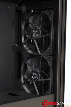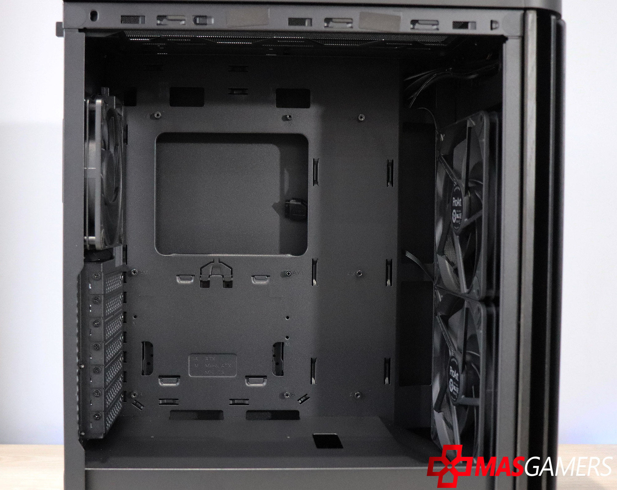 Los otros dos ventiladores los encontramos preinstalados en la parte frontal, que en este caso son de 160mm. Una medida poco convencional, que si en caso de sufrir algún daño sería algo complicado de reemplazar.