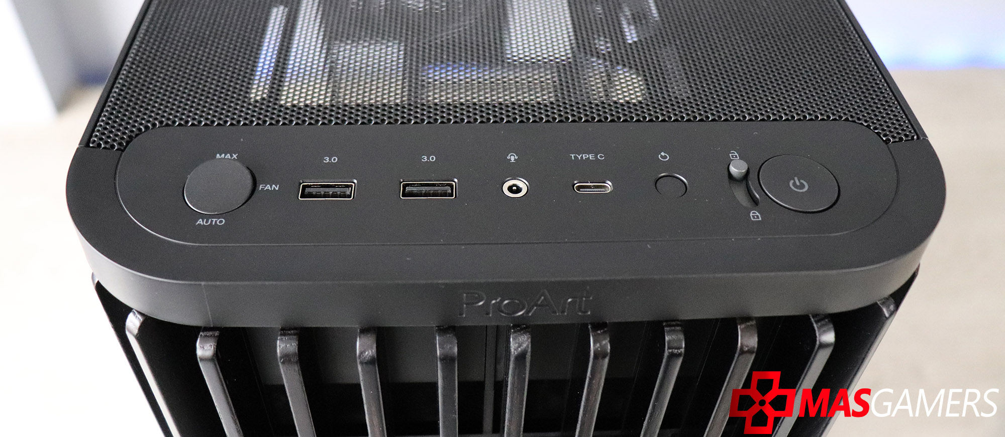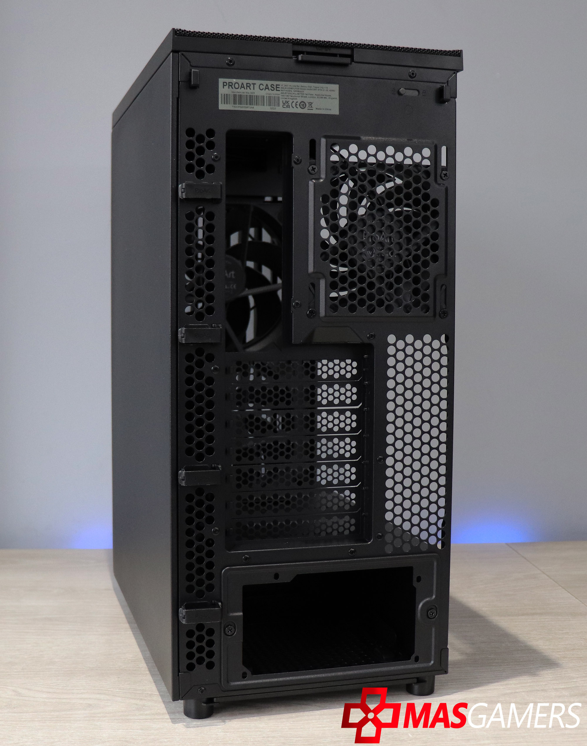 El frontal del ProArt PA401 presenta un diseño minimalista y elegante, en acabado negro mate, con líneas limpias que encajan perfectamente en un entorno profesional o creativo. No incluye iluminación RGB llamativa, siguiendo la filosofía ProArt de sobriedad. El panel lateral de vidrio templado que permite ver el interior del sistema, con un toque elegante pero discreto.