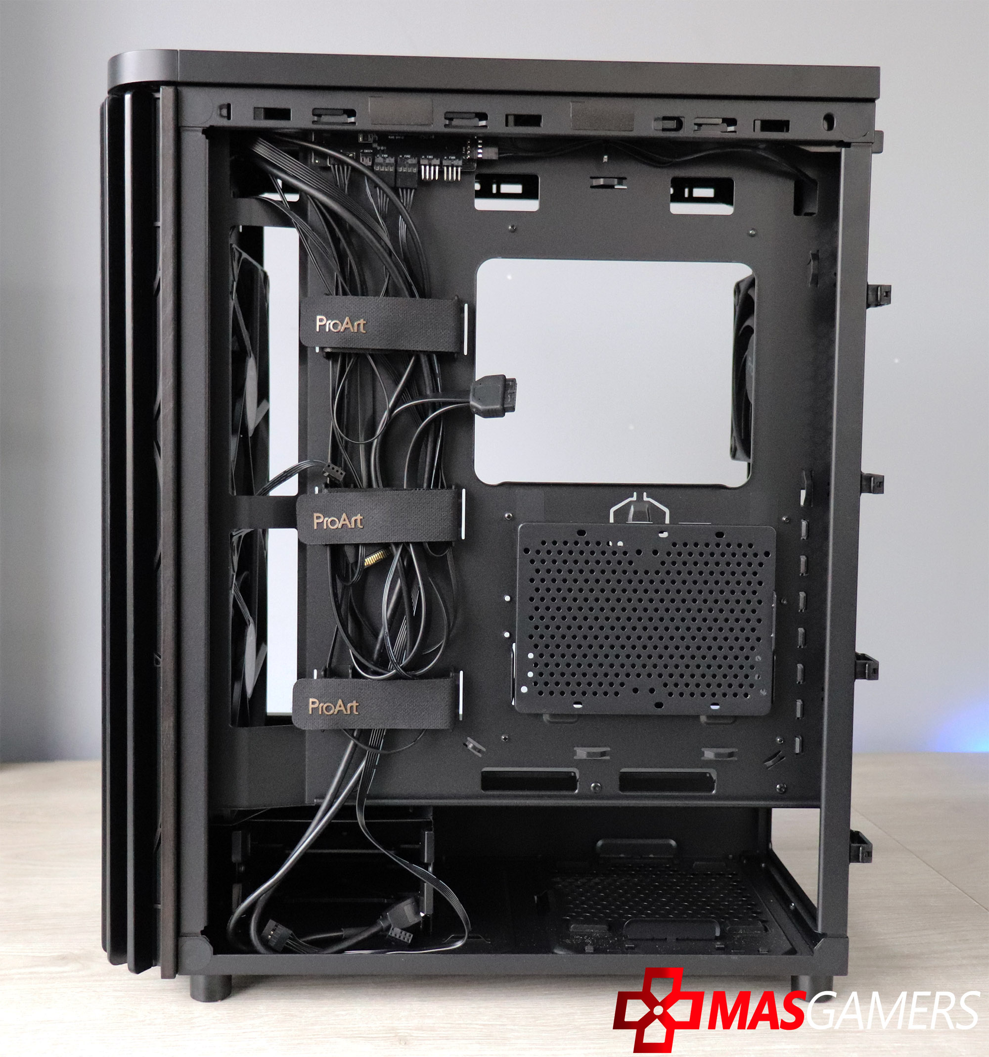 El ASUS ProArt PA401 ofrece una experiencia de montaje cómoda y bien pensada, incluso para quienes instalan hardware de alto rendimiento. El espacio interior amplio, la compatibilidad con GPUs de hasta 315 mm y radiadores de refrigeración líquida de hasta 280 mm en el frontal permiten configurar equipos potentes sin complicaciones. La gestión de cables es otro punto fuerte: los canales dedicados, pasacables con goma y bridas preinstaladas facilitan un armado limpio y ordenado, manteniendo la estética profesional que caracteriza a la serie ProArt.