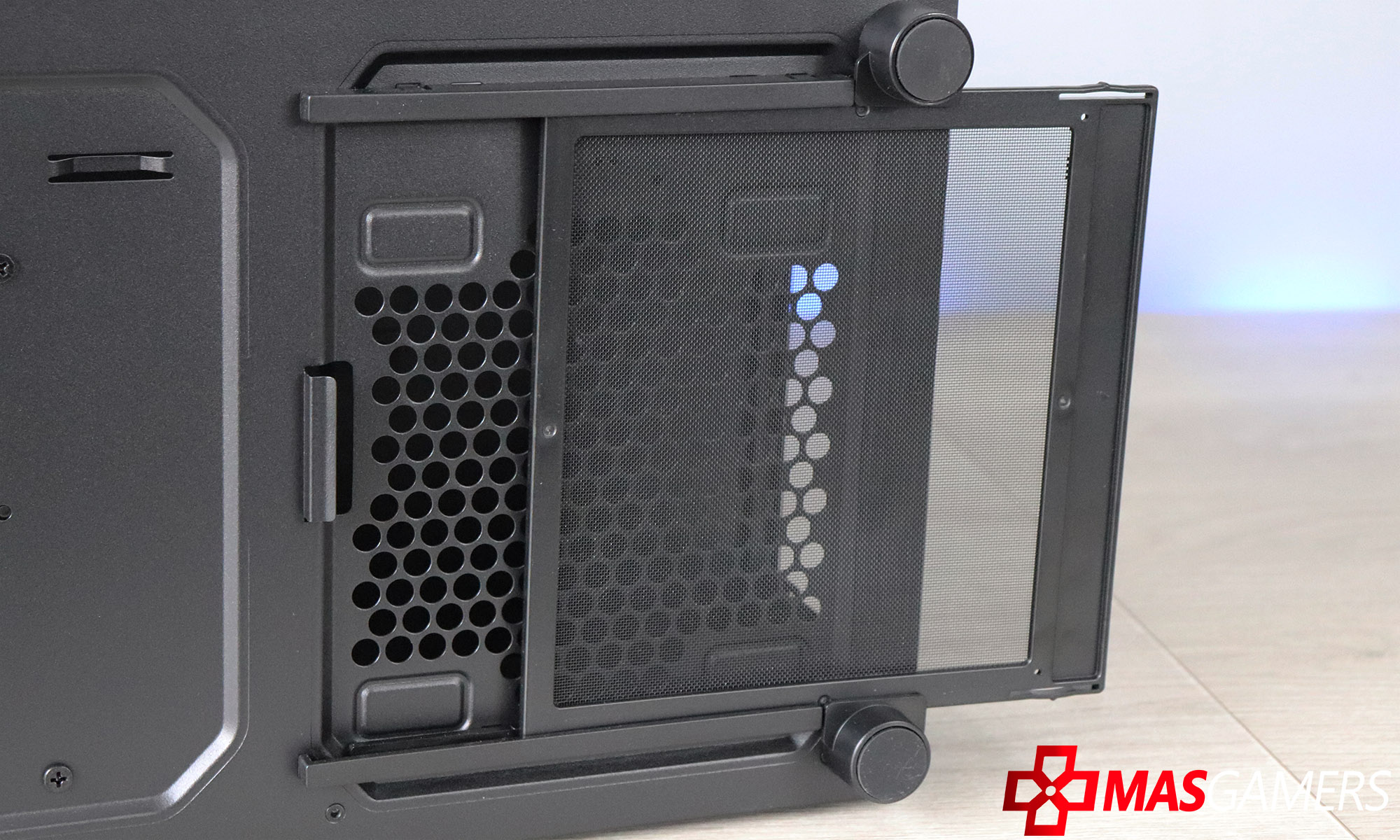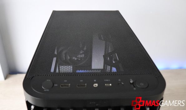 La zona superior incluye un panel de malla metálica con filtro antipolvo removible, lo que permite instalar ventiladores o un radiador de refrigeración líquida (hasta 240 mm). Este diseño favorece la salida de aire caliente y mantiene el flujo de ventilación equilibrado.