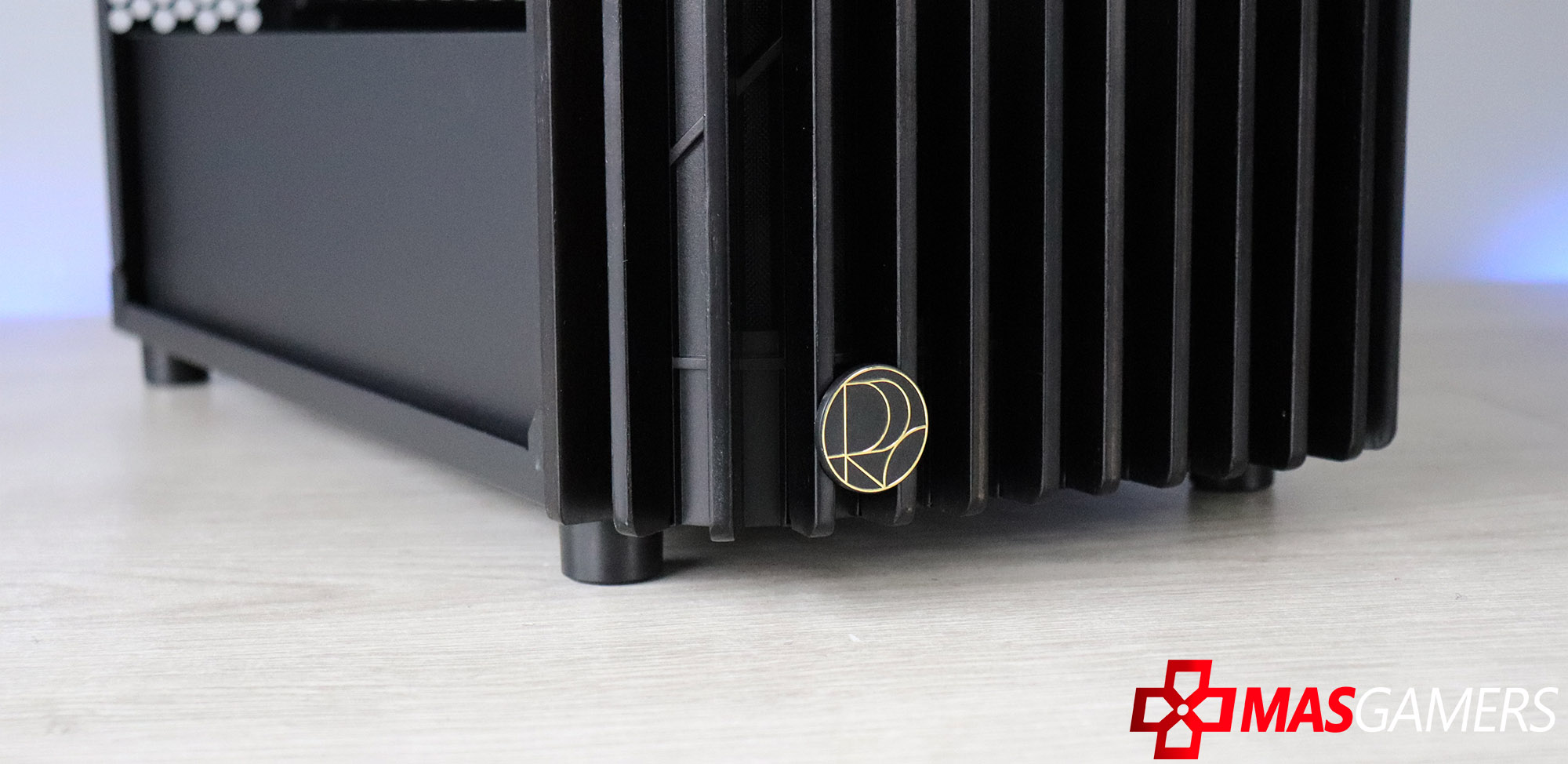 En la parte inferior se ubican los soportes del chasis, con patas de goma antideslizantes que aportan estabilidad y evitan vibraciones. También se encuentra un filtro extraíble para la fuente de poder, que facilita la limpieza y el mantenimiento del equipo.