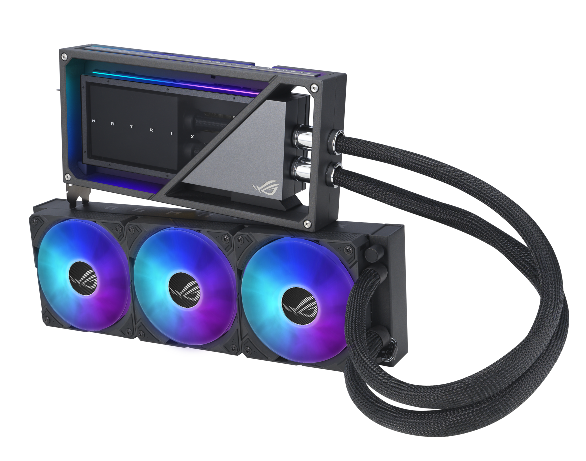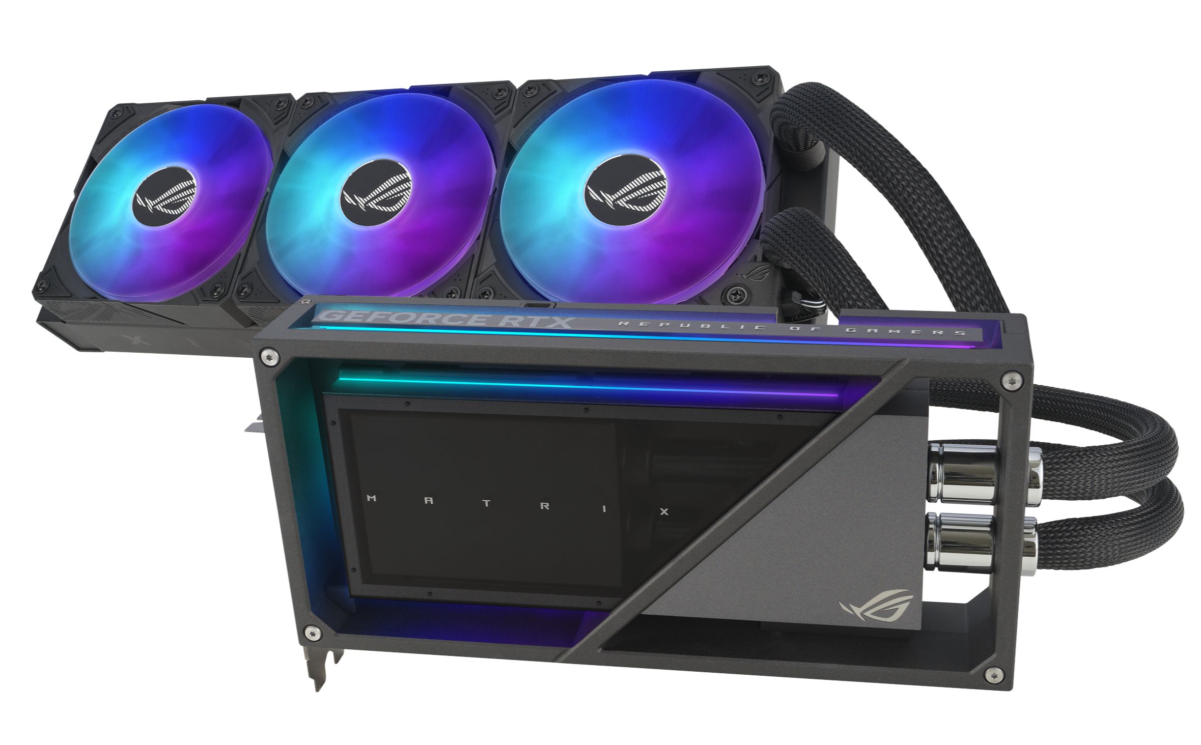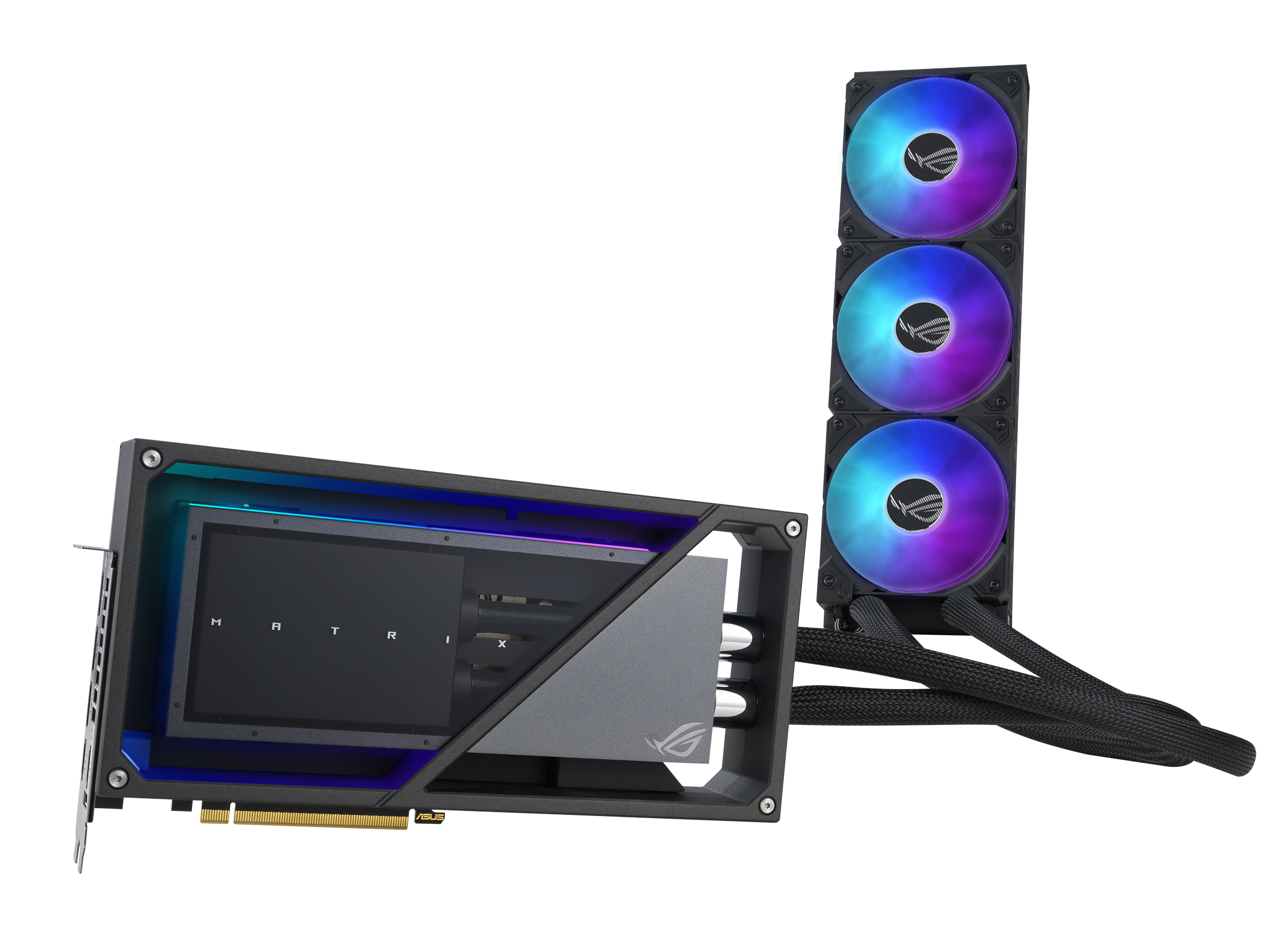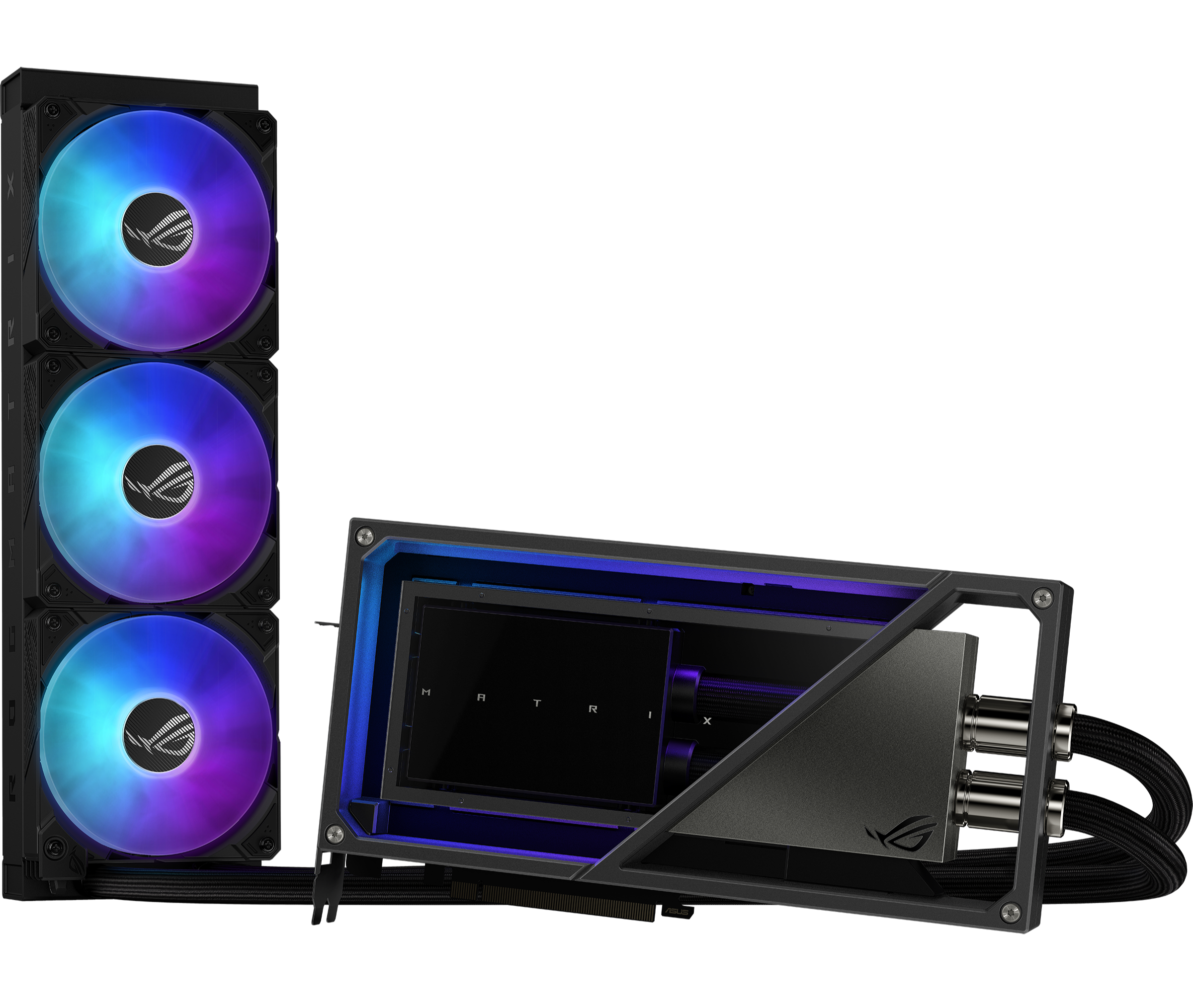 La ROG Matrix GeForce RTX 4090 es la primera GPU de producción que incorpora metal líquido como material de interfaz térmica para aprovechar su increíble conductividad y conseguir una refrigeración fuera de serie. El circuito de refrigeración «todo en uno» incluye una placa fría diseñada a medida, un ventilador de bomba integrado y un caudal de refrigerante optimizado. Esta configuración envía el calor a través de tubos de 700 mm y un radiador de 360 mm. Los ventiladores magnéticos encadenables facilitan el proceso de montaje y muestran la iluminación RGB propia del usuario, al tiempo que minimizan el desorden de cables para lograr un aspecto extremadamente limpio. Además, el suministro de energía de alta calidad mantiene la GPU alimentada en todo momento con energía estable y fiable.
