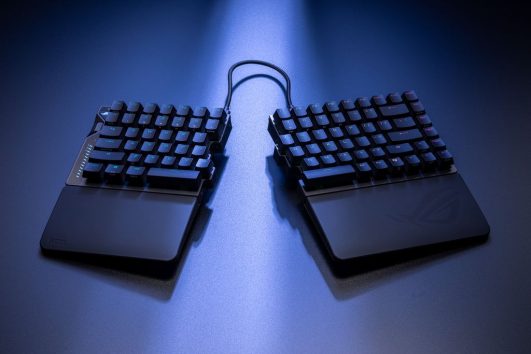 El ROG Falcata es un teclado gaming dividido al 75%, diseñado para ofrecer máxima precisión y flexibilidad. Su diseño dividido se adapta a distintas configuraciones de juego, permitiendo a los jugadores usar solo el lado izquierdo del teclado para liberar espacio y mejorar el movimiento con el mouse.
