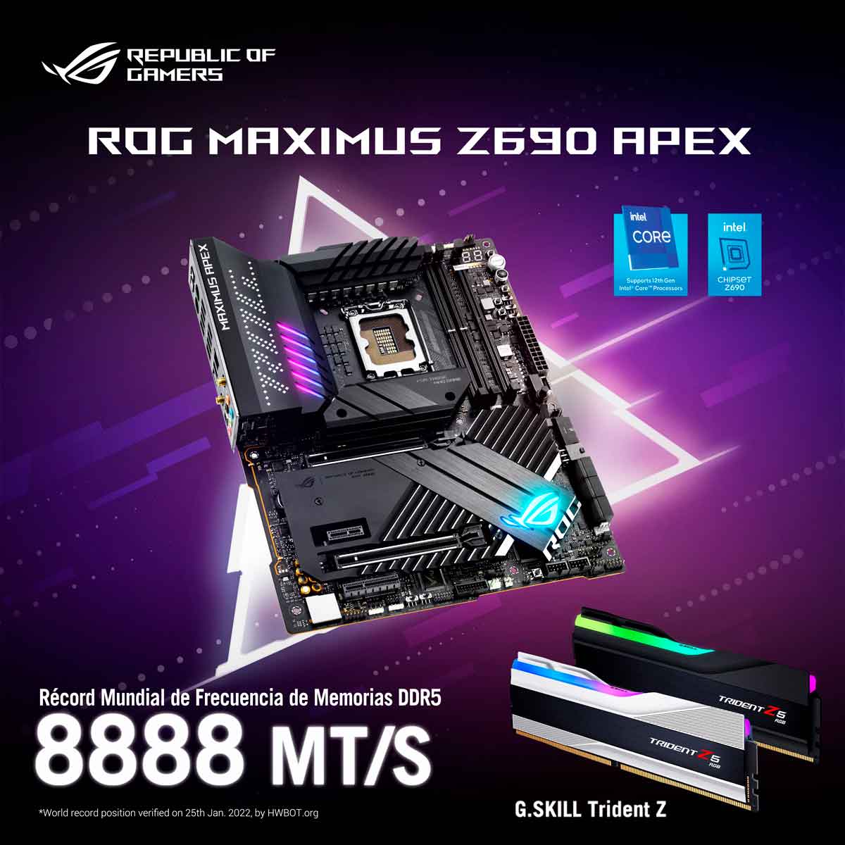 Asus Republic of Gamers ha cooperado recientemente con G.Skill, líder en fabricación de memorias de rendimiento extremo y periféricos gaming, para lograr un nuevo récord mundial de overclocking para la frecuencia de memoria más rápida en DDR5-8888 CL88-88-88-88. Esta velocidad de frecuencia fue lograda por el overclocker extremo «lupin_no_musume» con la memoria G.SKILL Trident Z5 DDR5, la placa base ASUS ROG Maximus Z690 APEX y el procesador Intel® Core™ i9-12900K. En el siguiente enlace se puede ver el momento exacto en que se estableció este increíble récord mundial de overclocking: