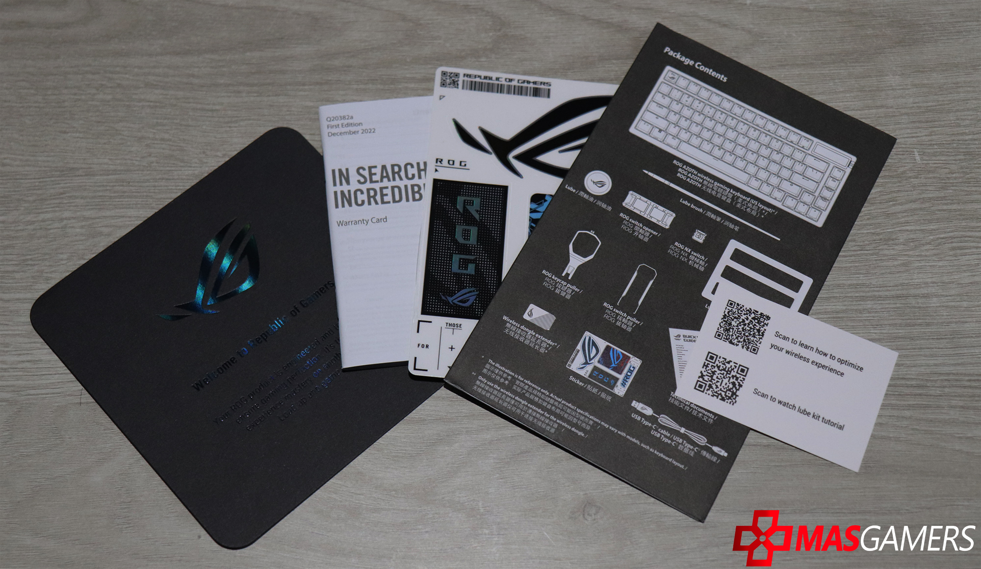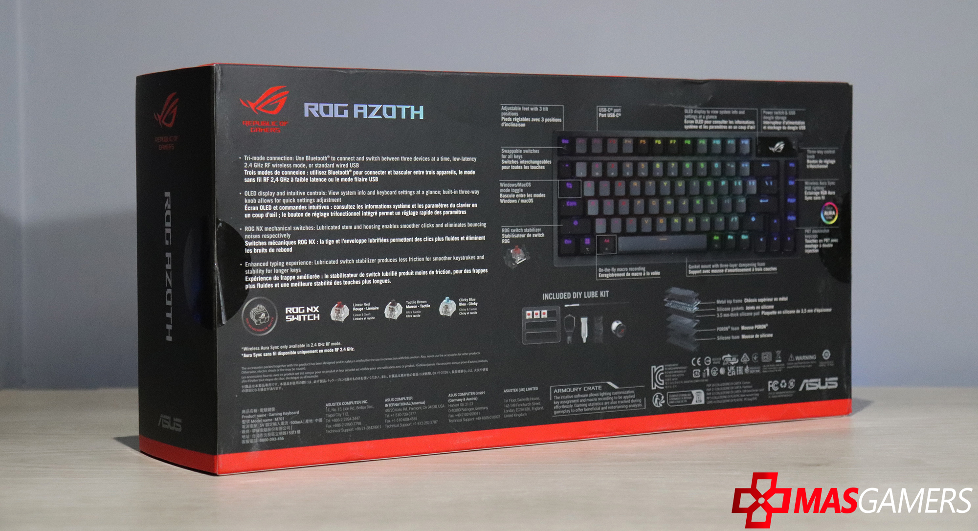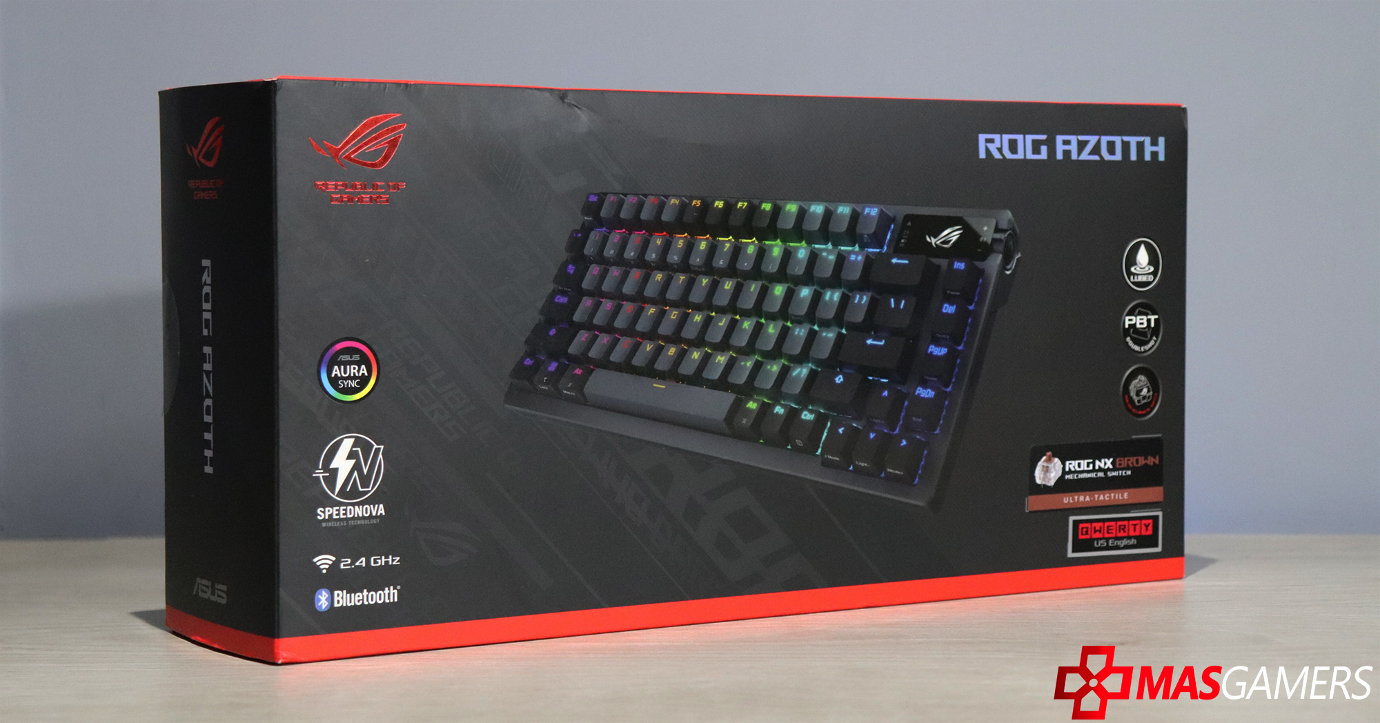 El empaque del teclado Azoth refleja el diseño premium y la atención al detalle que caracteriza a la línea Republic of Gamers. Al ser un producto de alta gama, el empaque está cuidadosamente diseñado para ofrecer una experiencia atractiva desde el primer momento.
