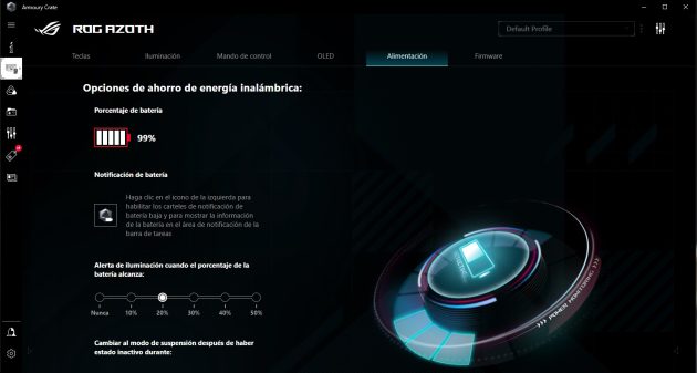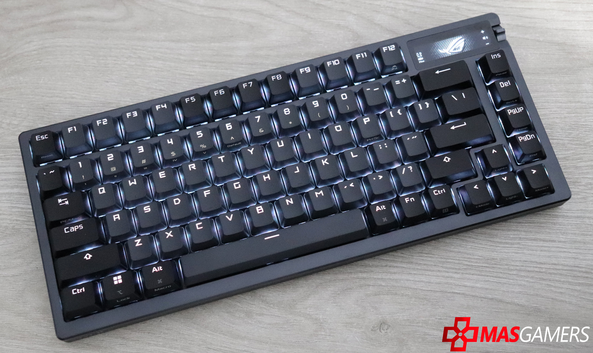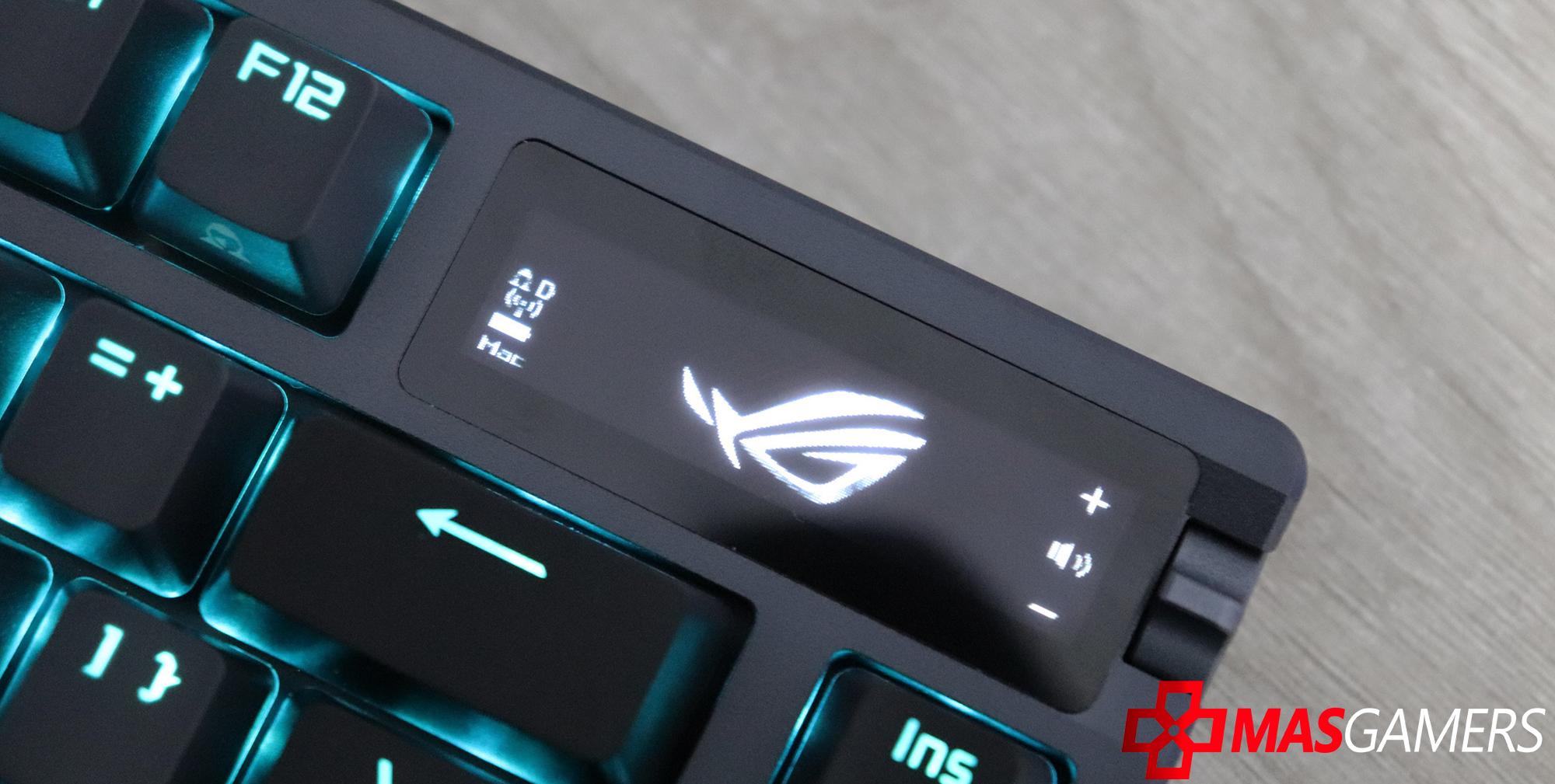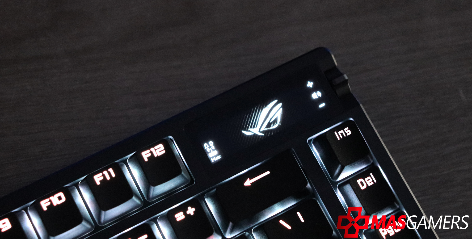 En la parte superior del teclado, una pequeña pantalla OLED personalizable destaca como una de las características más llamativas. Esta pantalla puede mostrar información como el estado del sistema, el nivel de batería, perfiles de usuario, animaciones, y mucho más. Es totalmente configurable a través del software ROG Armoury Crate.