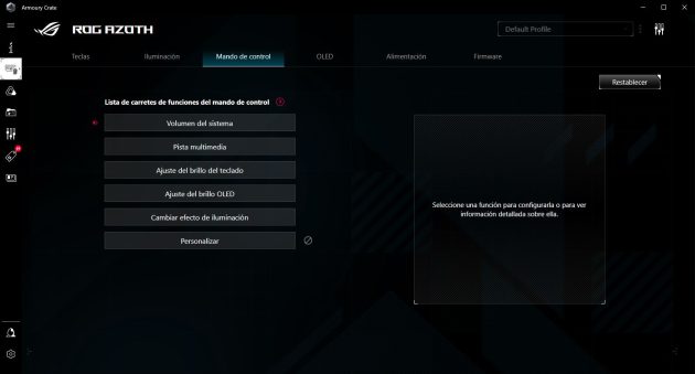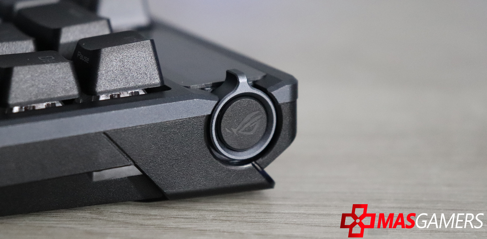 Justo al lado de la pantalla OLED, el ROG Azoth incluye una rueda de control y un botón adicional, que permiten ajustar el volumen, cambiar perfiles de iluminación, y otras funciones sin necesidad de usar el teclado completo.