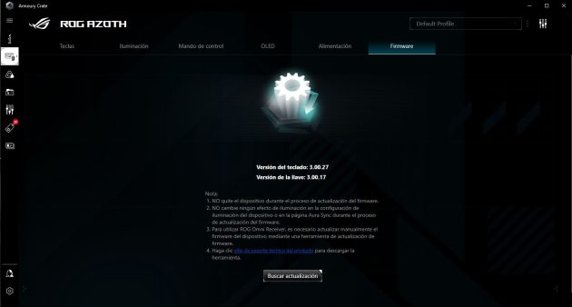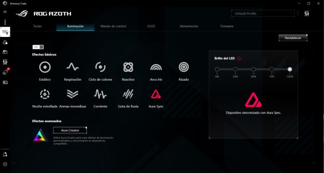 Como es habitual en productos de la línea ROG, el Azoth incluye iluminación RGB personalizable por tecla. Puedes ajustar la iluminación a través del software Armoury Crate y sincronizarla con otros periféricos compatibles con Aura Sync.