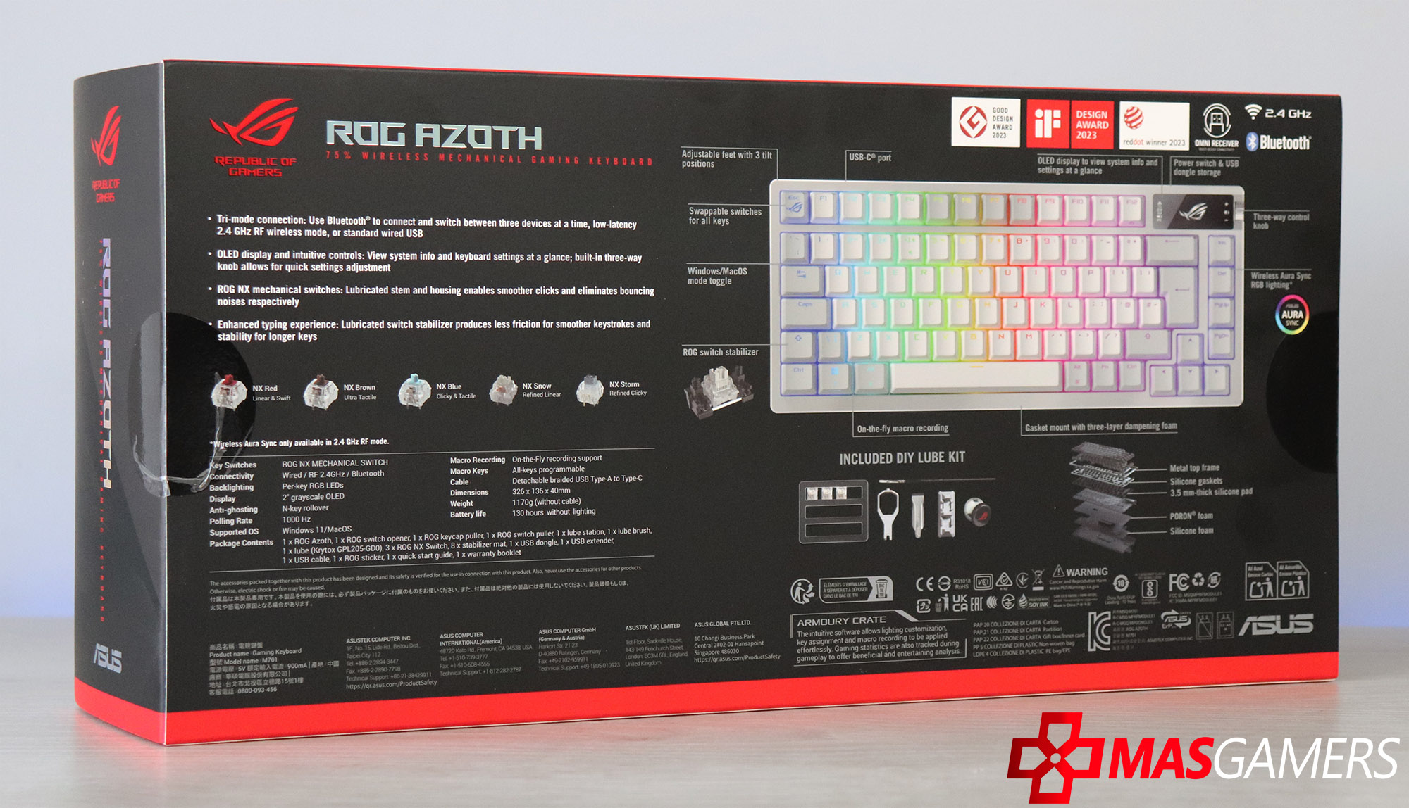 El empaque del teclado Azoth refleja el diseño premium y la atención al detalle que caracteriza a la línea Republic of Gamers. Al ser un producto de alta gama, el empaque está cuidadosamente diseñado para ofrecer una experiencia atractiva desde el primer momento.