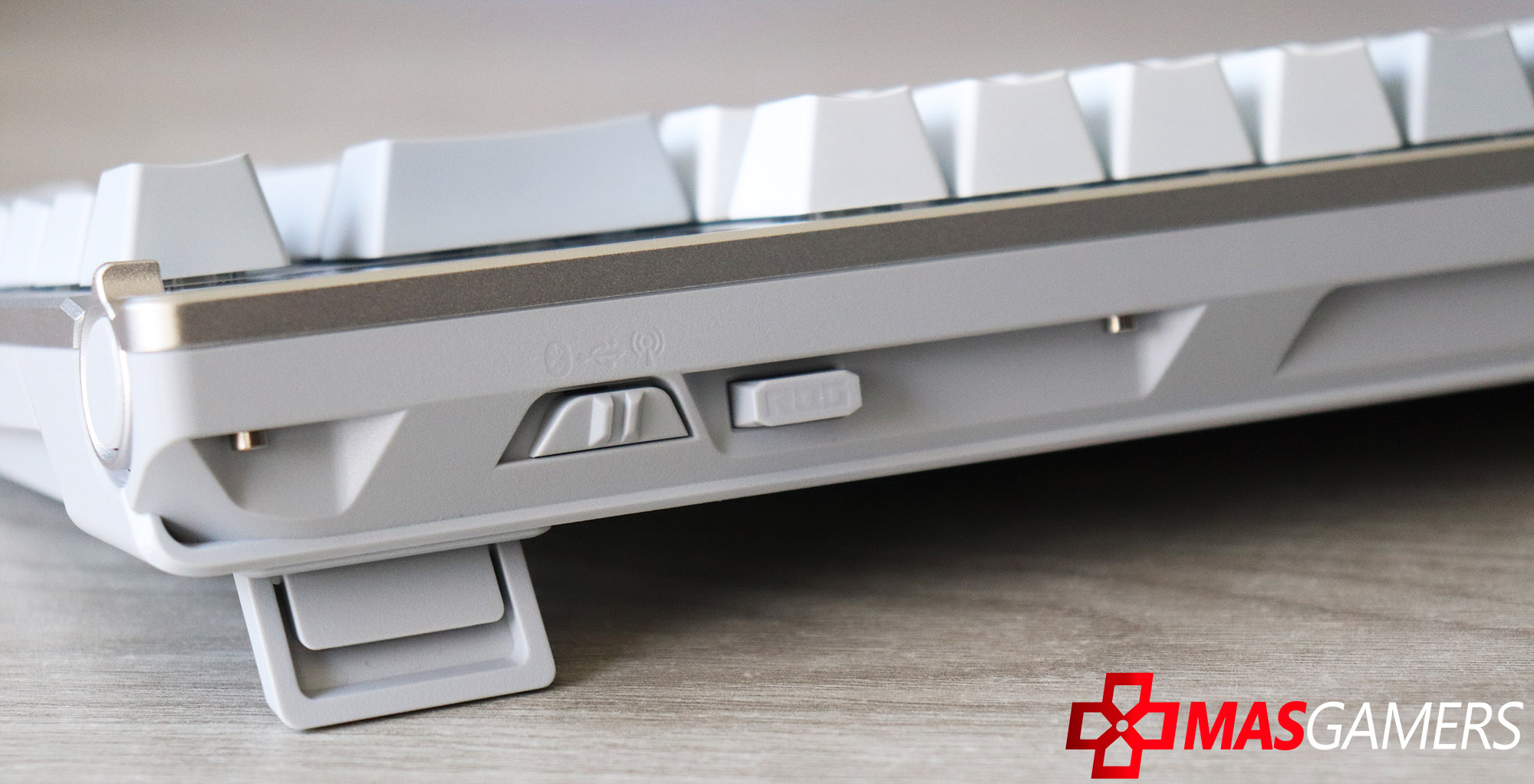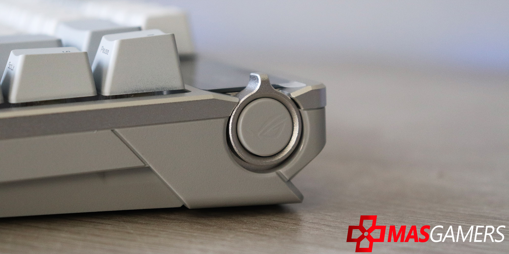 Las keycaps PBT de doble inyección en color blanco destacan por su textura ligeramente rugosa y alta resistencia al desgaste, manteniendo las leyendas intactas con el paso del tiempo. Debajo de ellas se encuentran los switches mecánicos ROG NX, prelubricados de fábrica, que aportan un recorrido suave y un sonido controlado. La iluminación RGB por tecla se filtra de manera uniforme, realzando el contraste sobre el acabado claro del teclado.