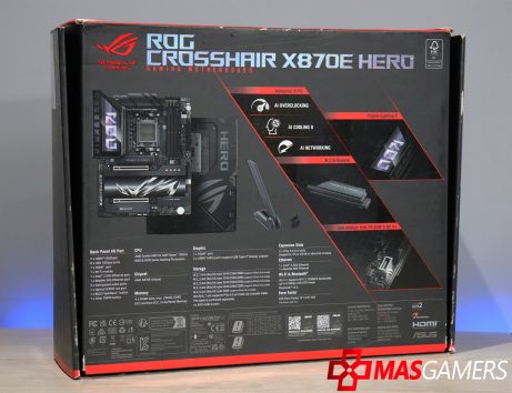 Esta ASUS ROG CROSSHAIR X870E HERO viene protegida por la clásica estética ROG en rojo y negro, mostrando su diseño en el frontal y sus principales características y especificaciones técnicas en el reverso.