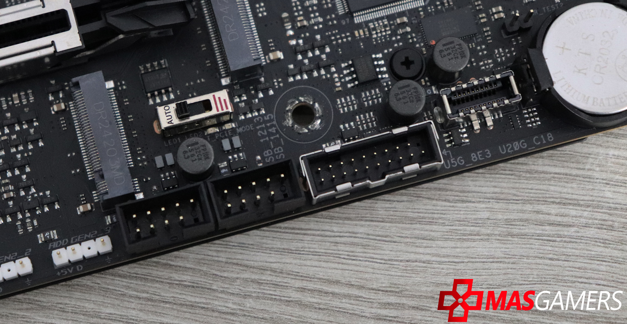 En la base encontramos 2 conectores ARGB ADD_Gen2_2 para poder conectar todos los dispositivos de iluminación que veamos convenientes. También en esta zona encontramos el switch que nos permite cambiar entre las distintas versiones de PCIe para evitar problemas de compatibilidad.