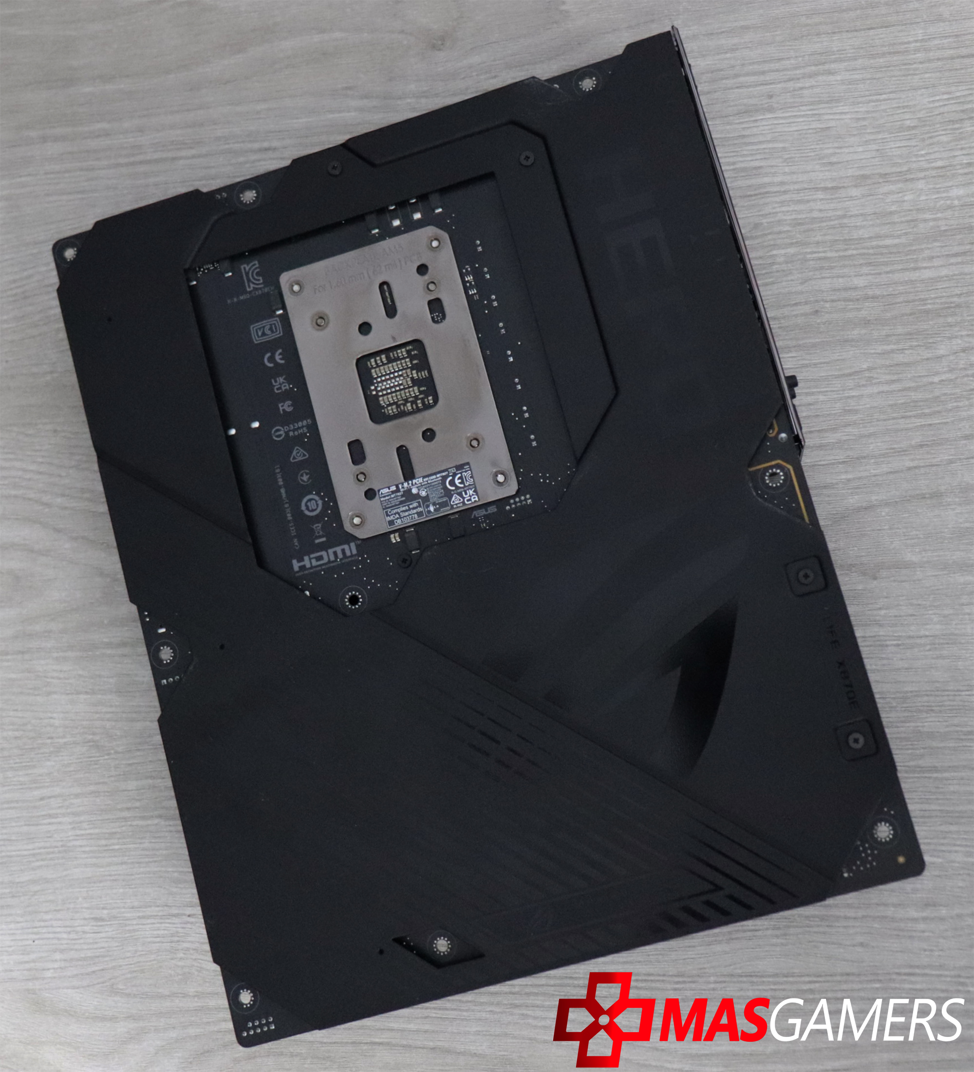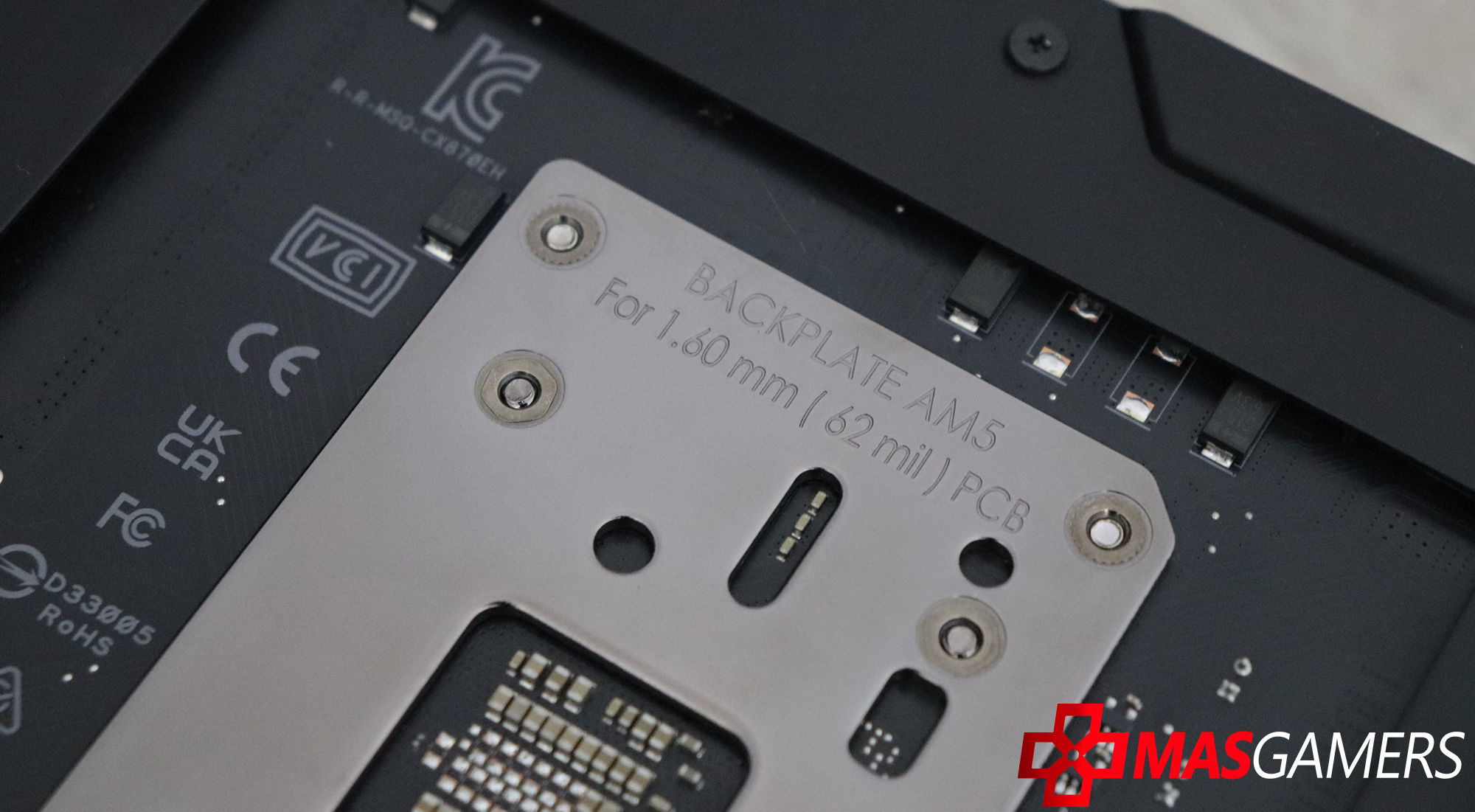 En la parte posterior encontramos el backplate que nos proporciona no solo mayor rigidez, sino que también cumple la función de ayudar a disipar el calor de los componentes de esta placa base.