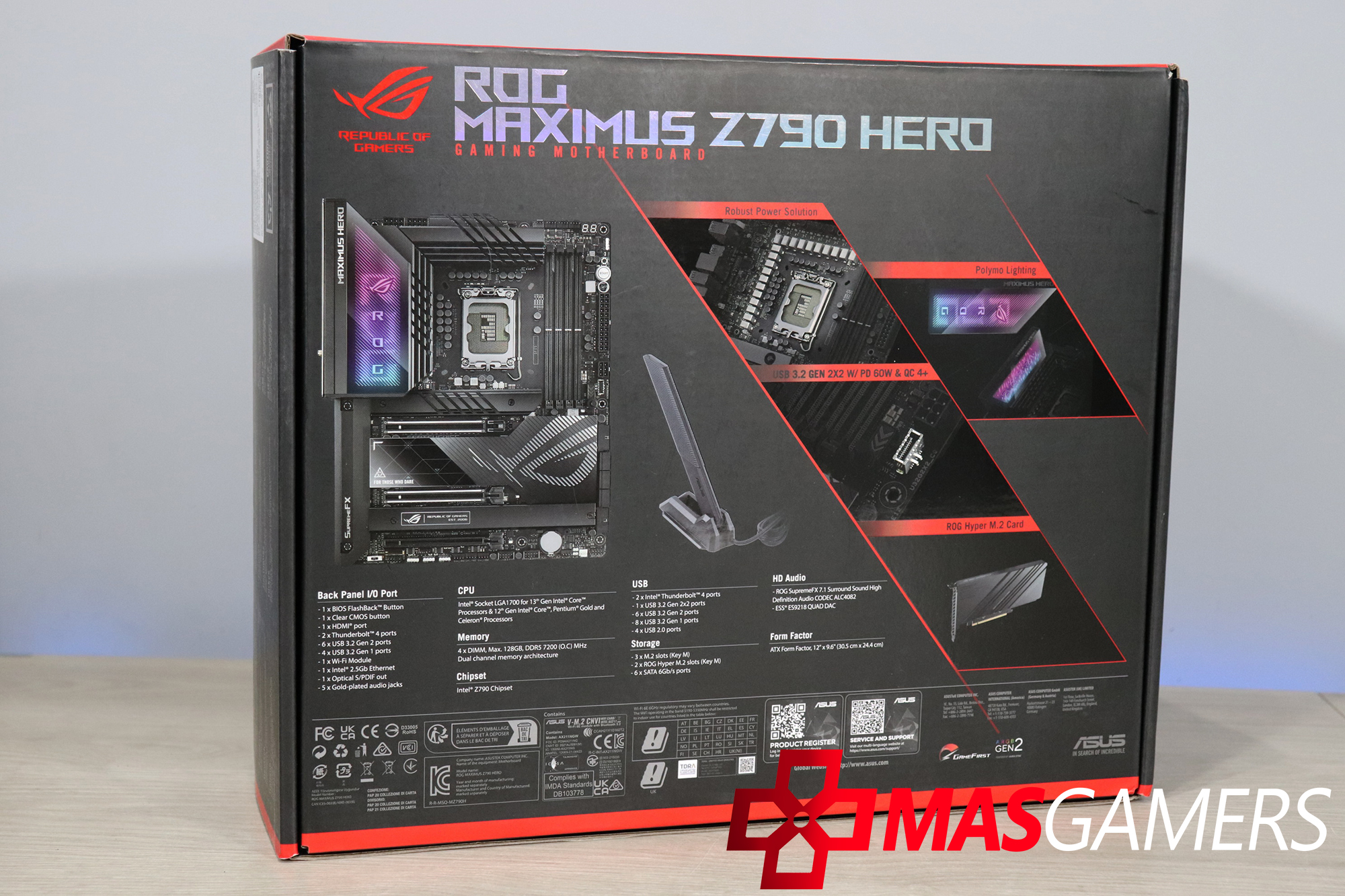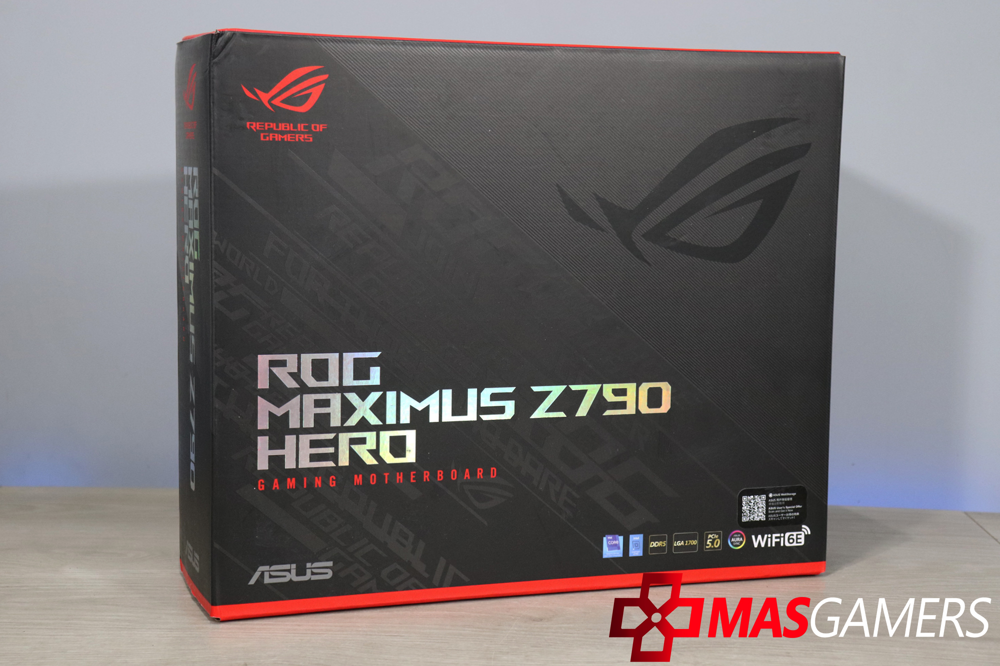 La nueva Asus ROG MAXIMUS Z790 HERO viene protegida por la clásica estética ROG en rojo y negro, mostrando su diseño en el frontal y sus principales características y especificaciones técnicas en el reverso.