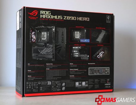 Nuestra motherboard ROG MAXIMUS Z890 HERO viene protegida por la clásica estética ROG en rojo y negro, mostrando su diseño en el frontal y sus principales características y especificaciones técnicas en el reverso.