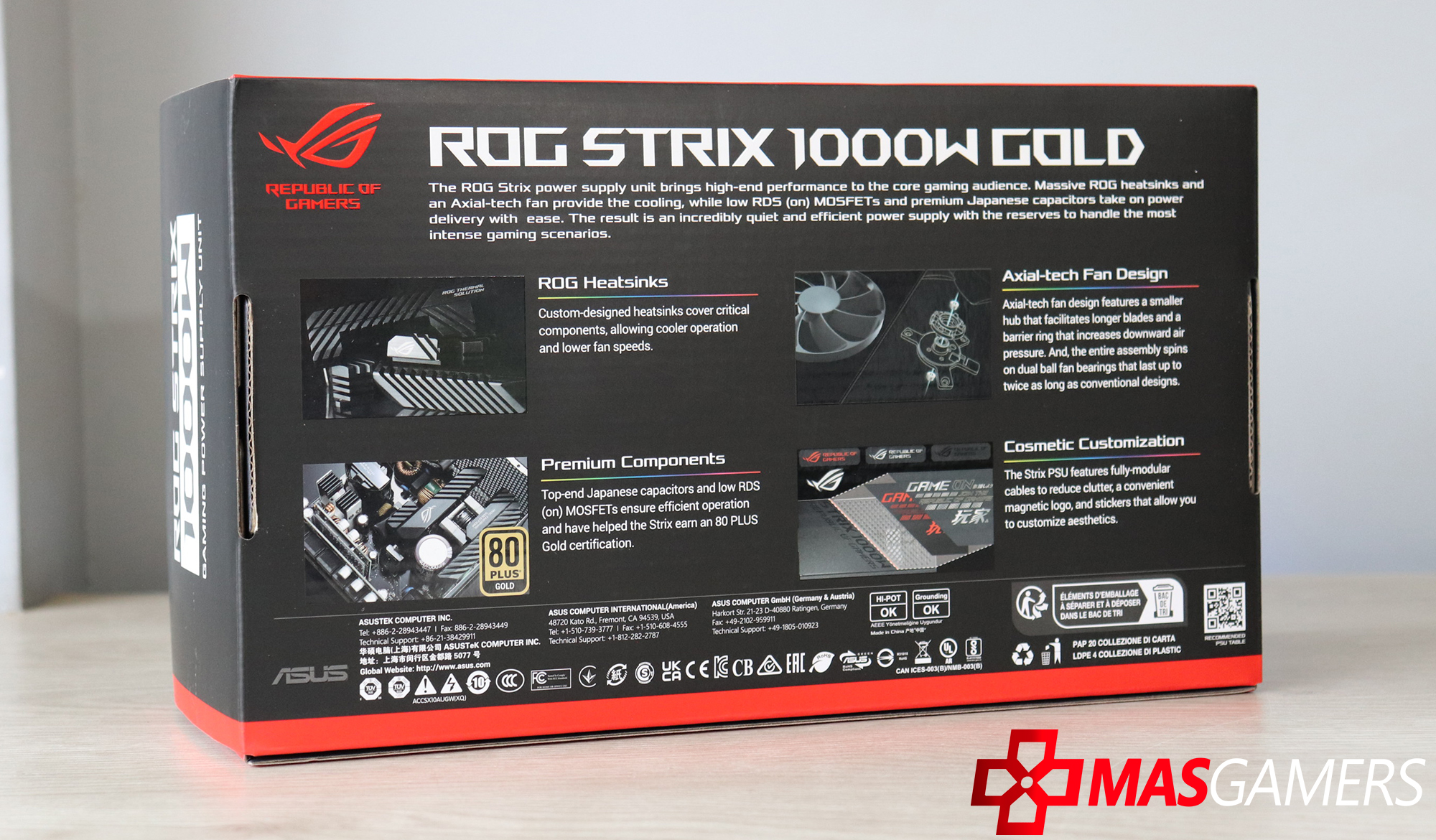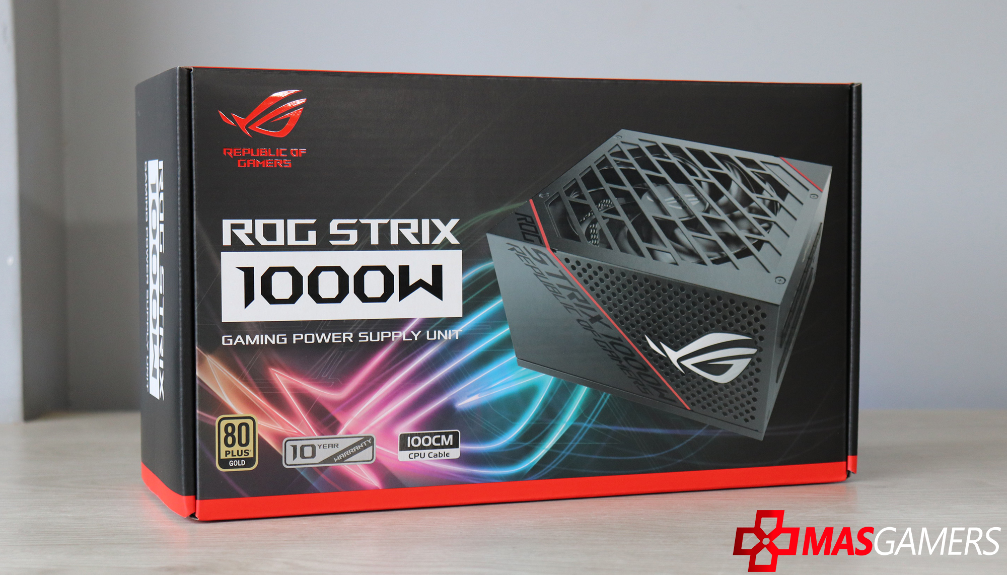La nueva ASUS ROG STRIX 1000W viene protegida en una caja con el diseño estándar de los modelos sTRIX. Una imagen del producto en la parte delantera y la capacidad de energía en la parte inferior.